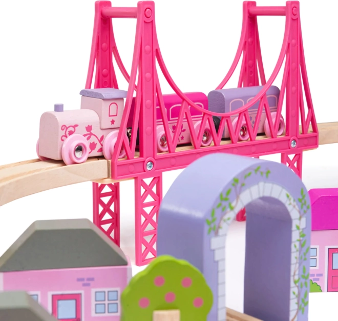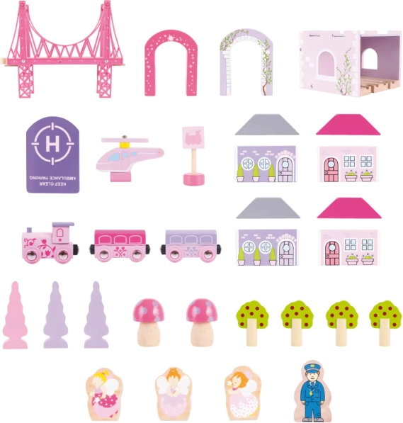 The original wooden Princess Train Set features beautiful pink and purple shades with 75 accessory pieces for little ladies. Encourages imagination and develops motor skills of your children.
