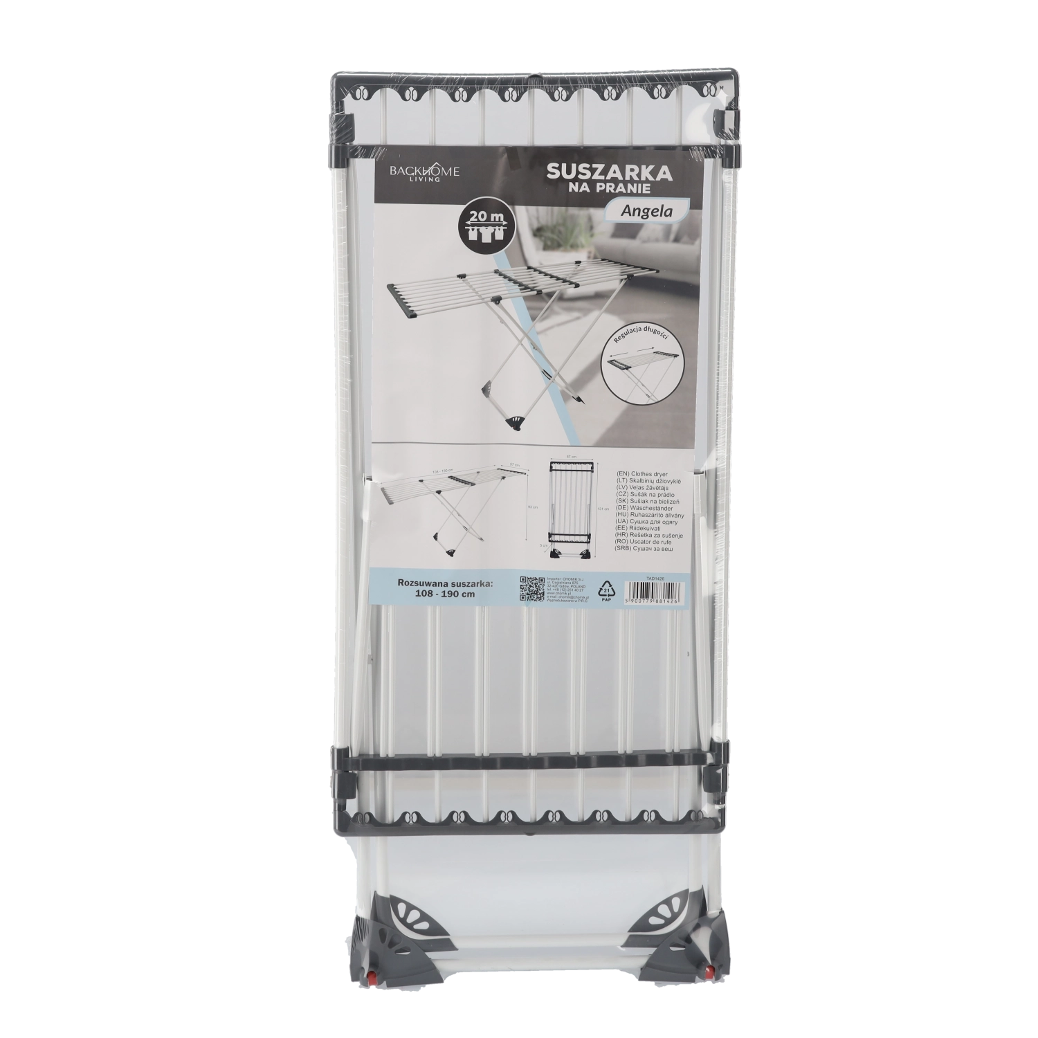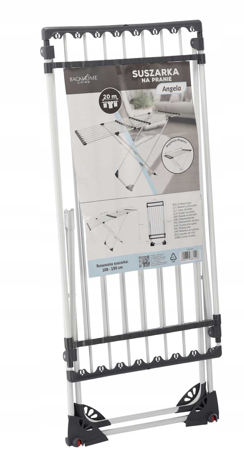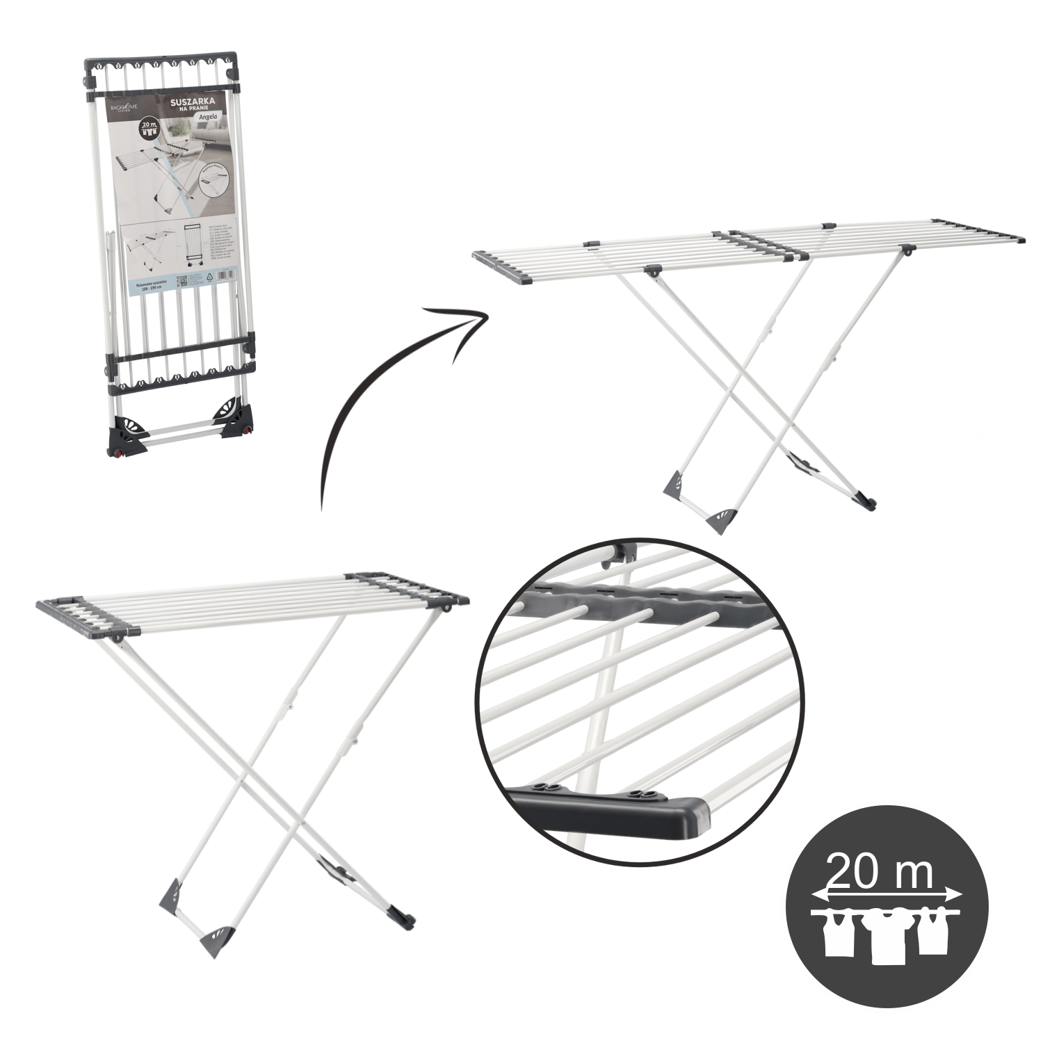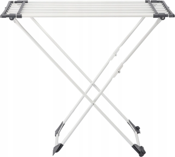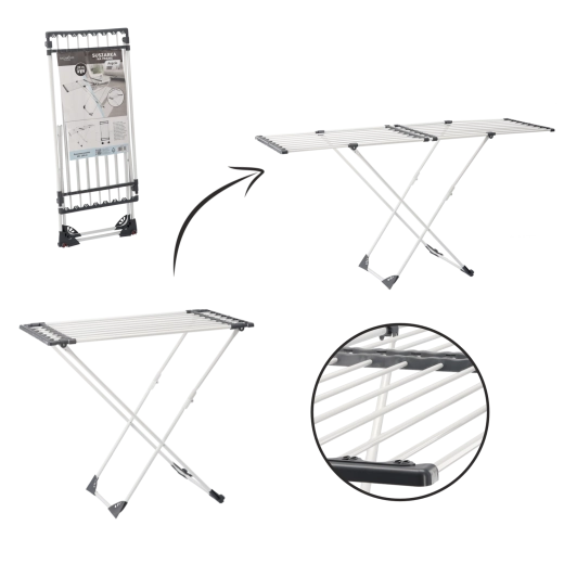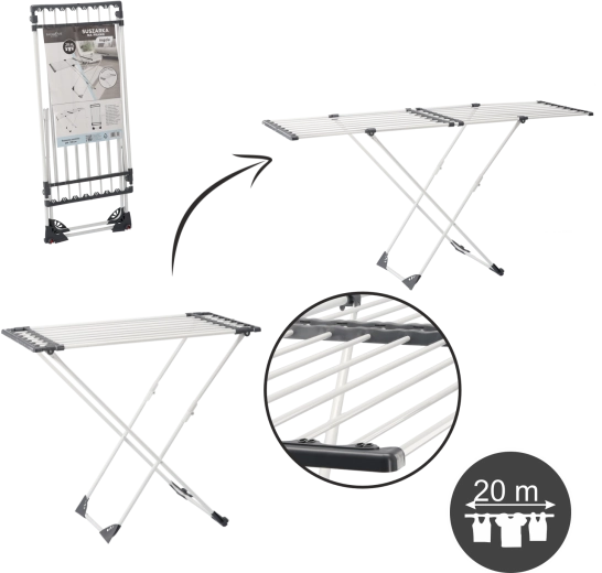 The practical Angela clothes drying rack is ideal for any household. It offers an adjustable length of 108–190 cm, fold-out side wings for extra space, and a stable, corrosion-resistant frame for long-lasting use. When folded, it’s compact and easy to store.