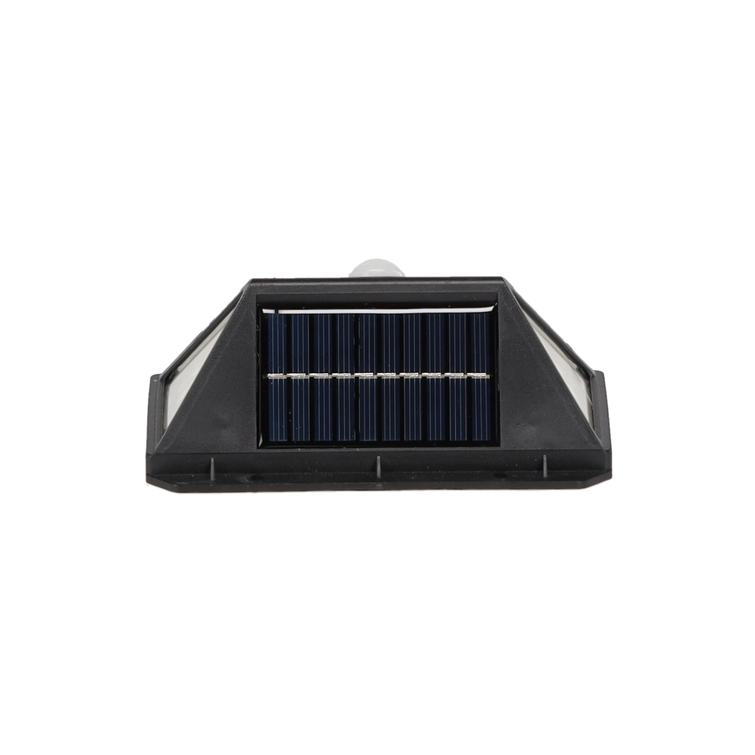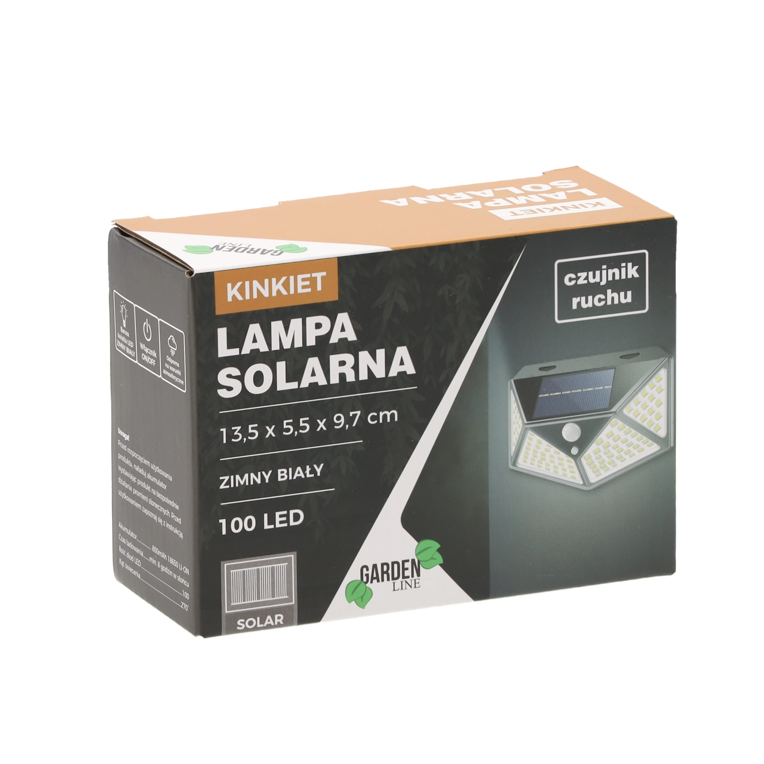 Compact dimensions of 13.5 × 5.5 × 9.7 cm allow for discreet installation on walls by entrances, garages, or fences. The built-in 18650 Li‑ion 800 mAh battery charges during the day via the top solar panel and at night delivers bright cool white light without the need for a power outlet.
