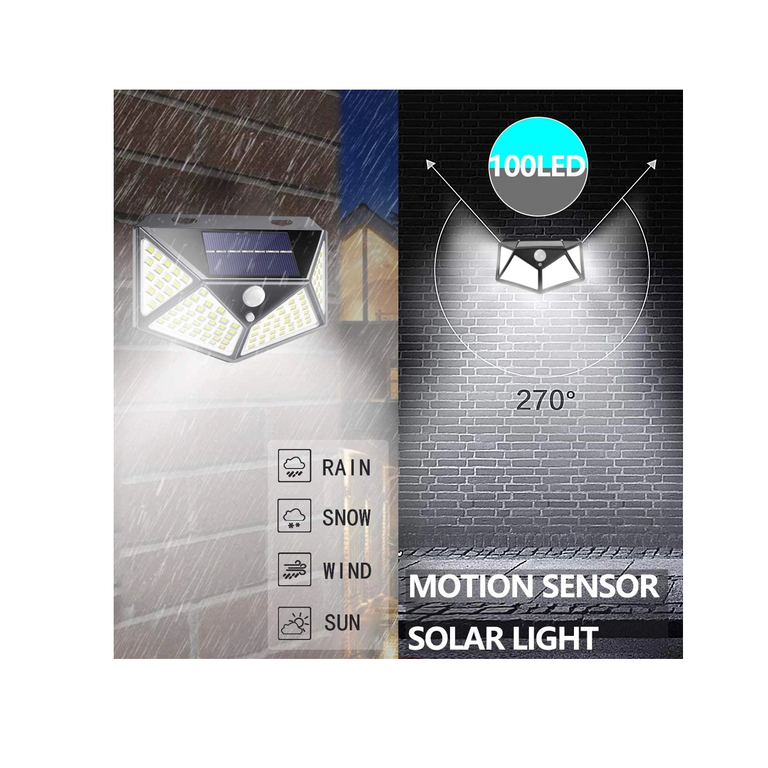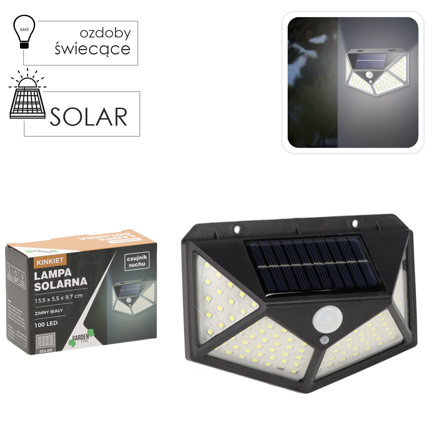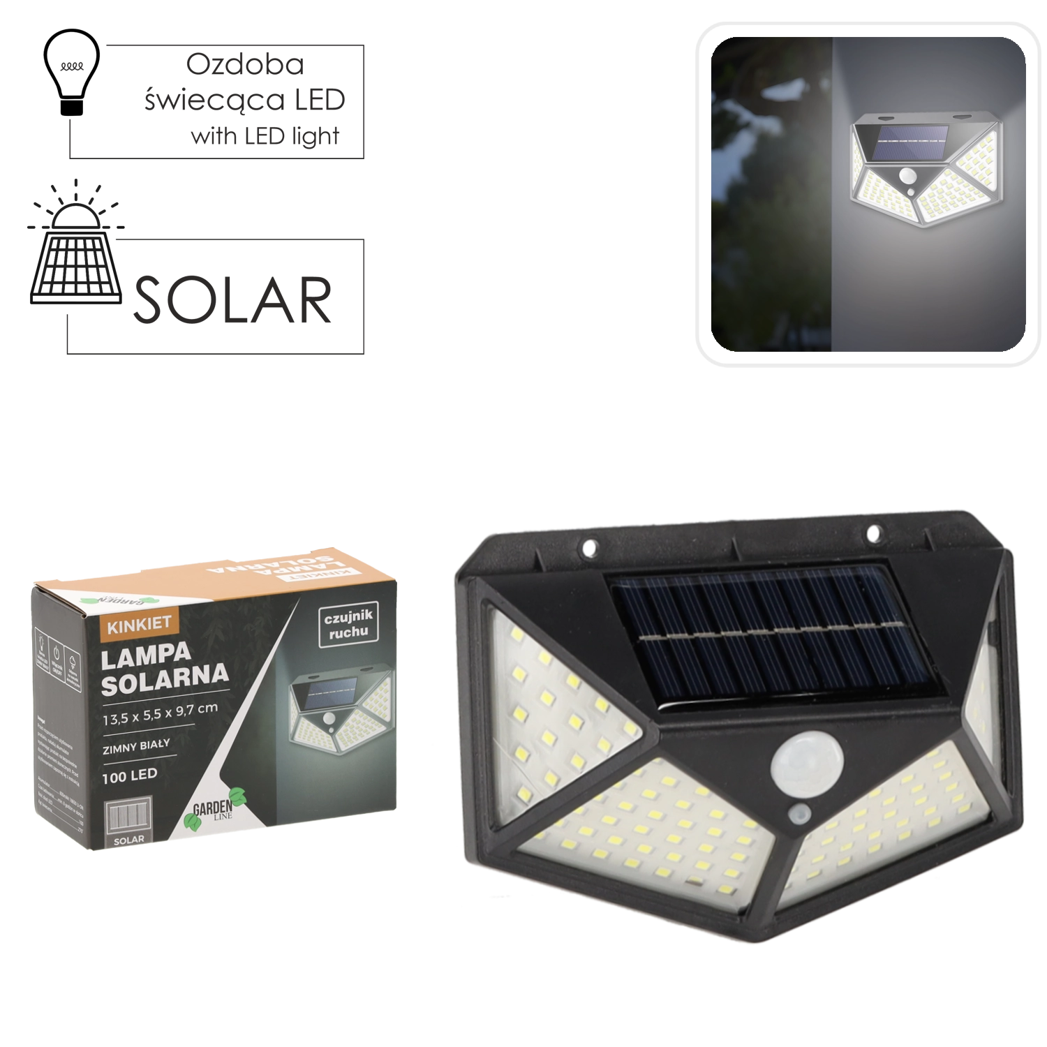 Solar wall-mounted LED light with motion sensor, 100 LEDs, cool white