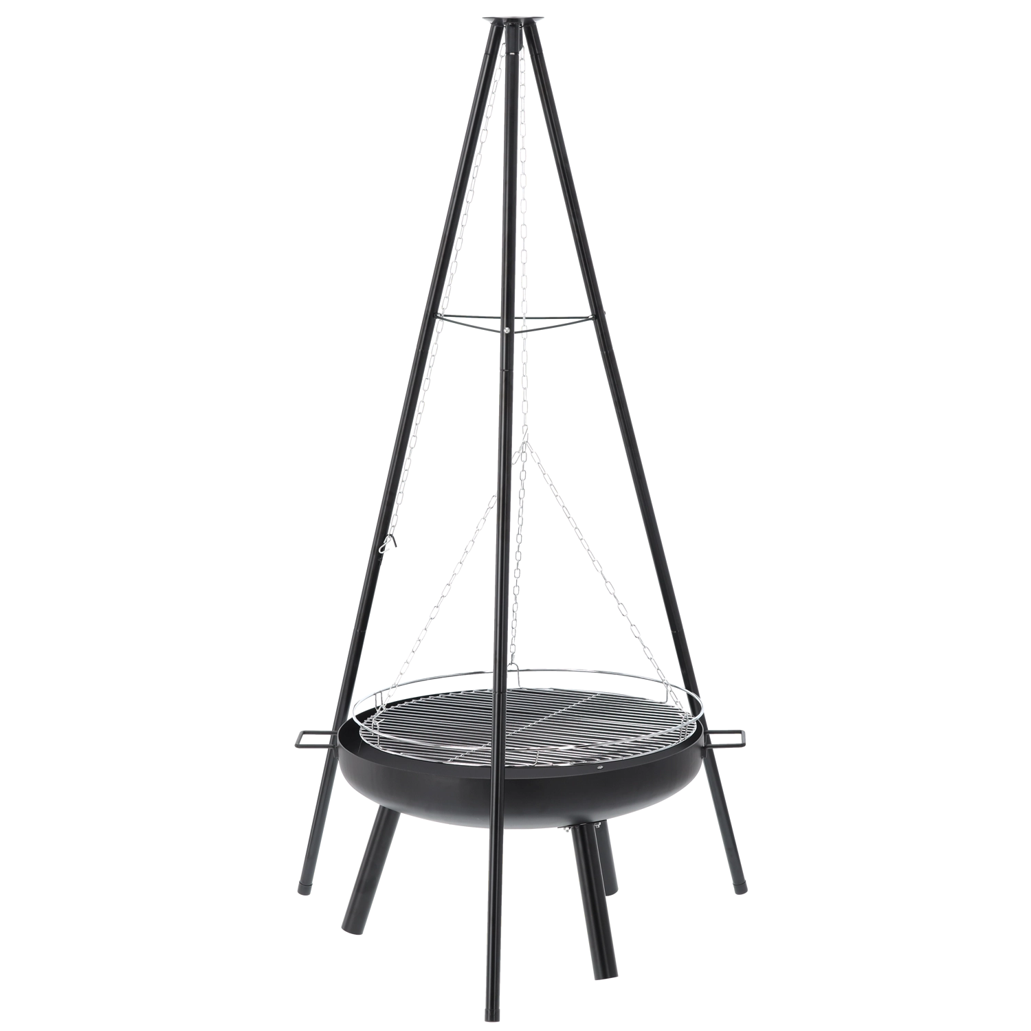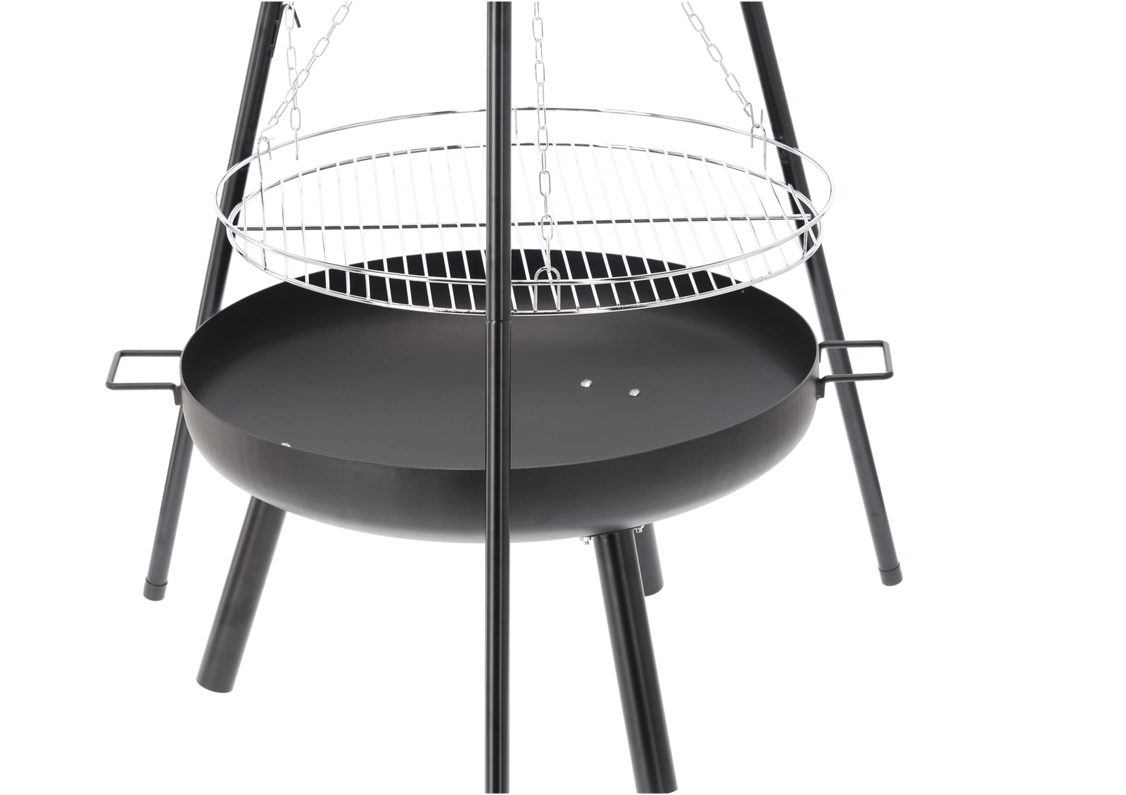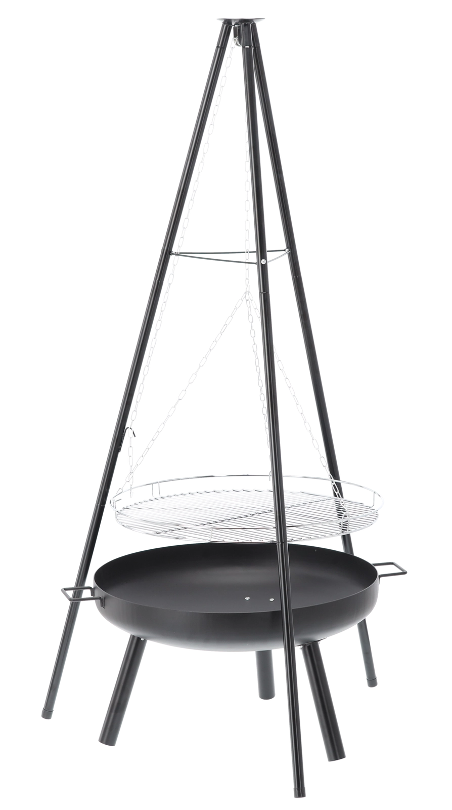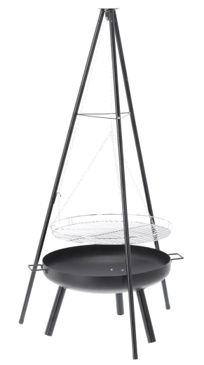 A stylish 2-in-1 solution: fire bowl and hanging grill. The robust 2 mm steel bowl with a heat-resistant black finish guarantees durability even with frequent use. Thanks to the chain-hung grate, you can easily set the distance from the heat and prepare juicy meat, vegetables, and skewers exactly to taste.