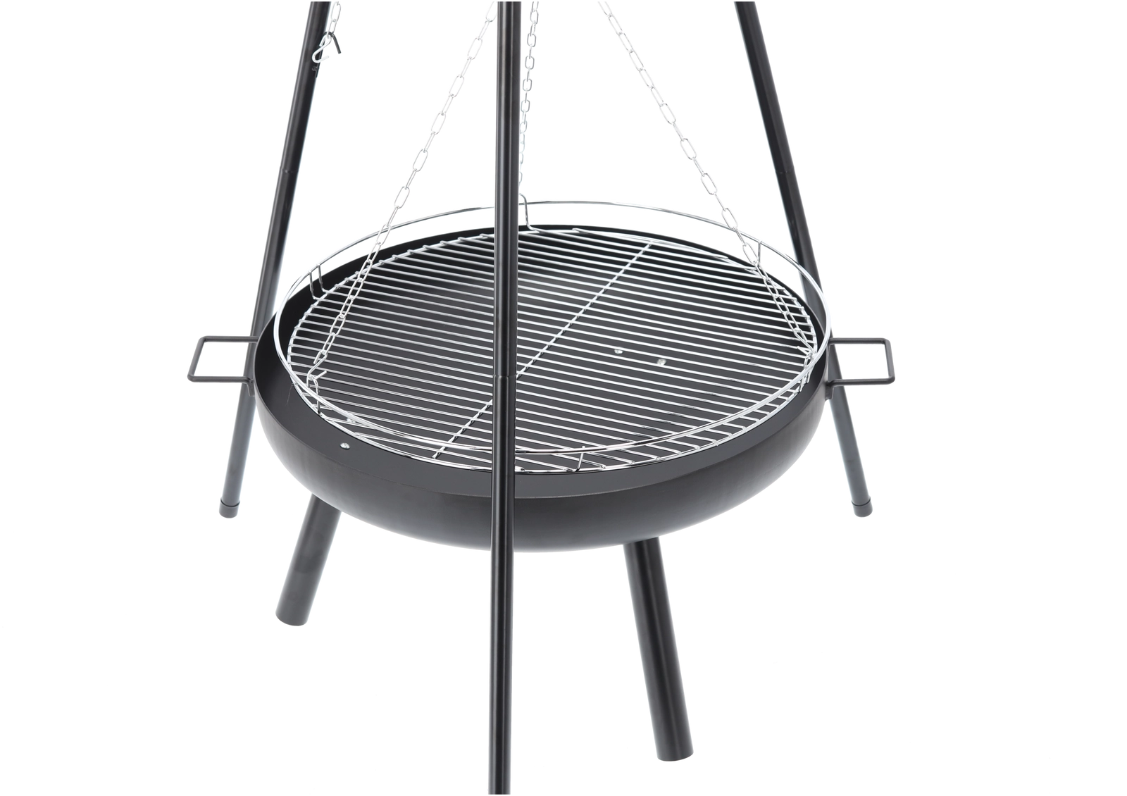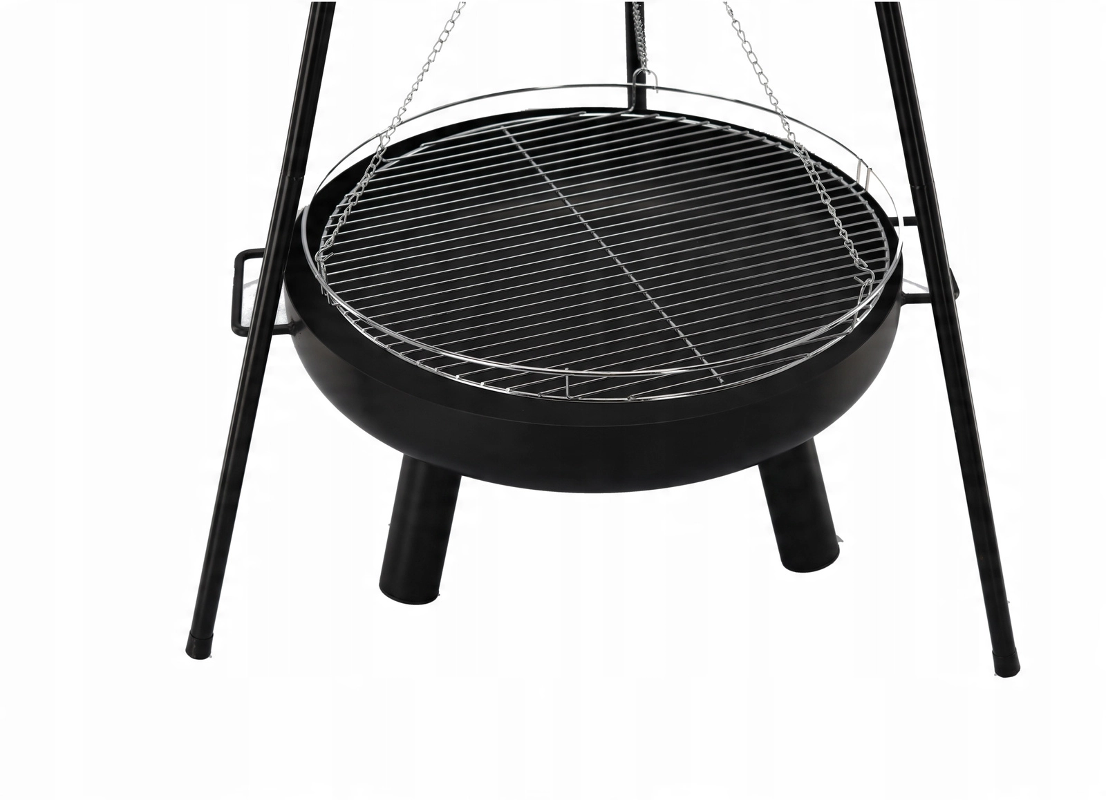 The hanging grate on chains lets you easily change the distance from the heat for full control over grilling.