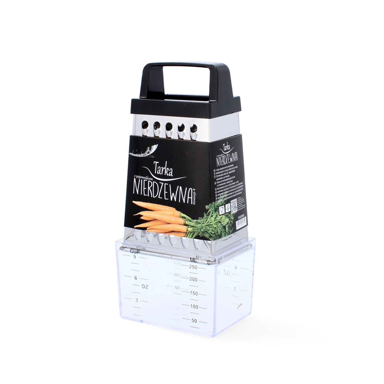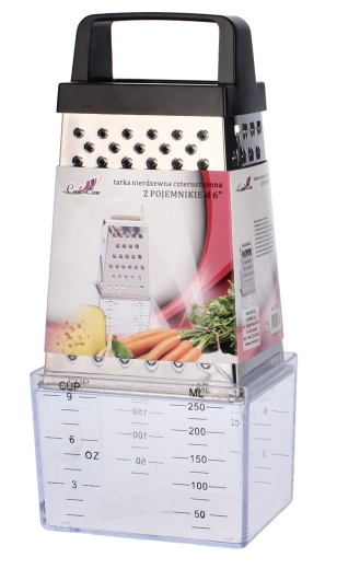 The four working sides cover all common kitchen needs: fine and extra fine grating for cheeses or citrus zest, coarse grating for vegetables, and slicing for quick cutting. The ergonomic handle provides a secure grip and comfort even during extended use.