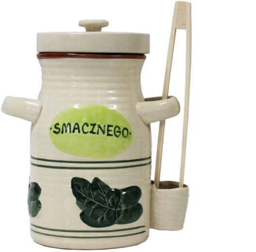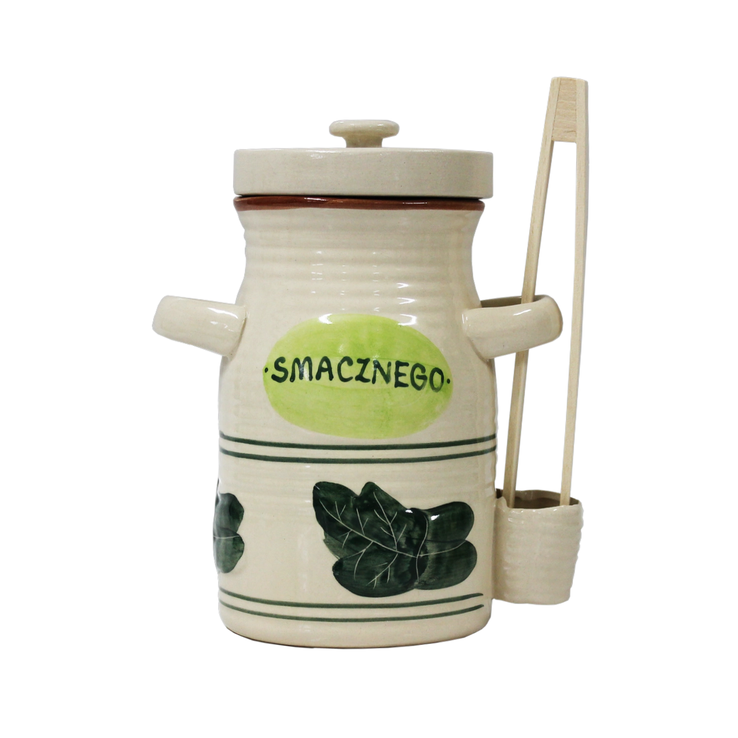 A practical 3.5 l ceramic jar, ideal for pickling cucumbers and fermenting homemade foods. The high-quality ceramic is non-toxic, acid-resistant, and does not affect taste. Includes a ceramic lid and 22 cm wooden tongs for easy handling. An integrated side pocket for the tongs and the “Smacznego” inscription add both practical and aesthetic appeal.