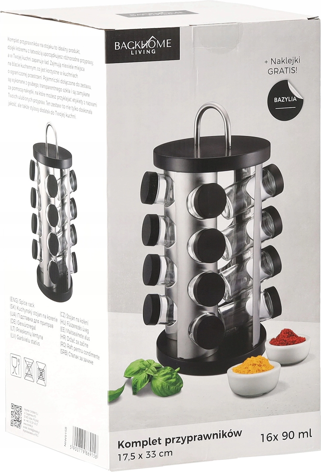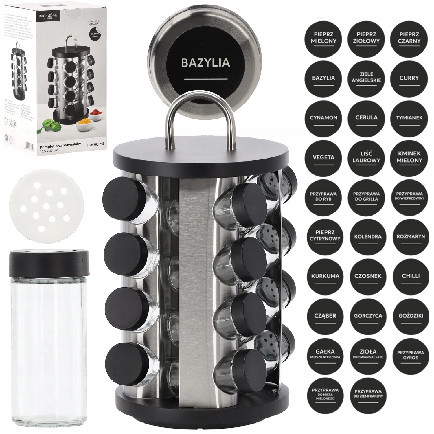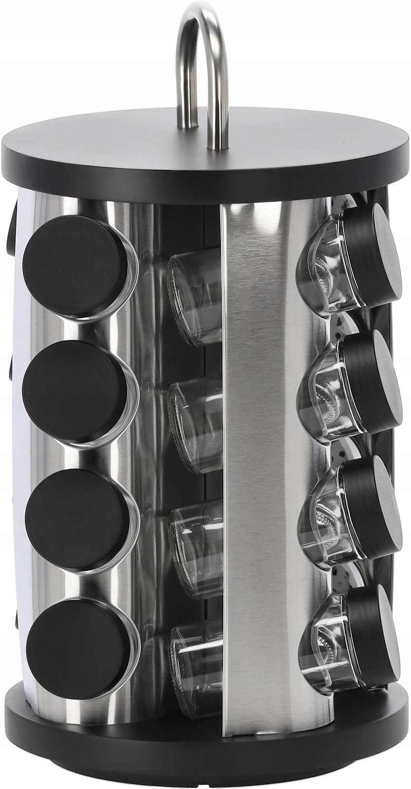 A stylish and practical rotating spice rack with a diameter of 17.5 cm and a height of 33 cm, featuring a stable handle for easy carrying. The stainless steel body in a black–silver finish and 16 transparent glass jars (90 ml) with black lids keep your spices organized and within reach. The smooth 360° mechanism ensures quick access to every flavor in your kitchen.