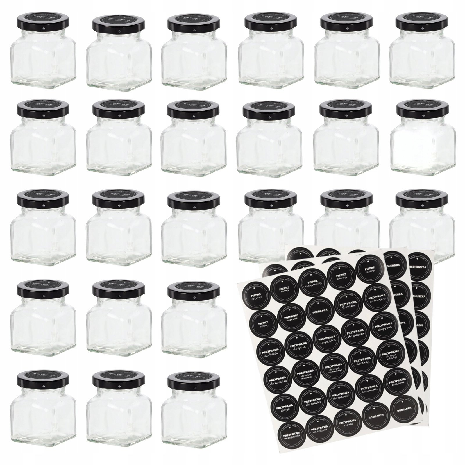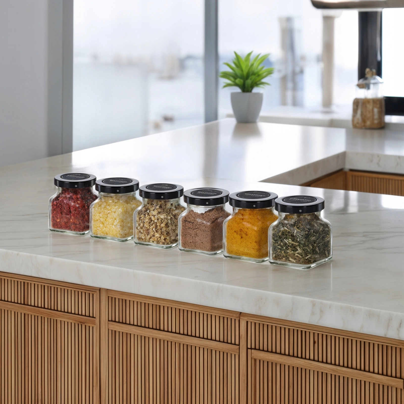 Bring order to your spices, herbs, and small ingredients. The 120 ml square jars stack neatly side by side, save space on shelves, and look great. The transparent glass helps you quickly find what you need, and the black screw-on lids keep the contents fresh for longer.