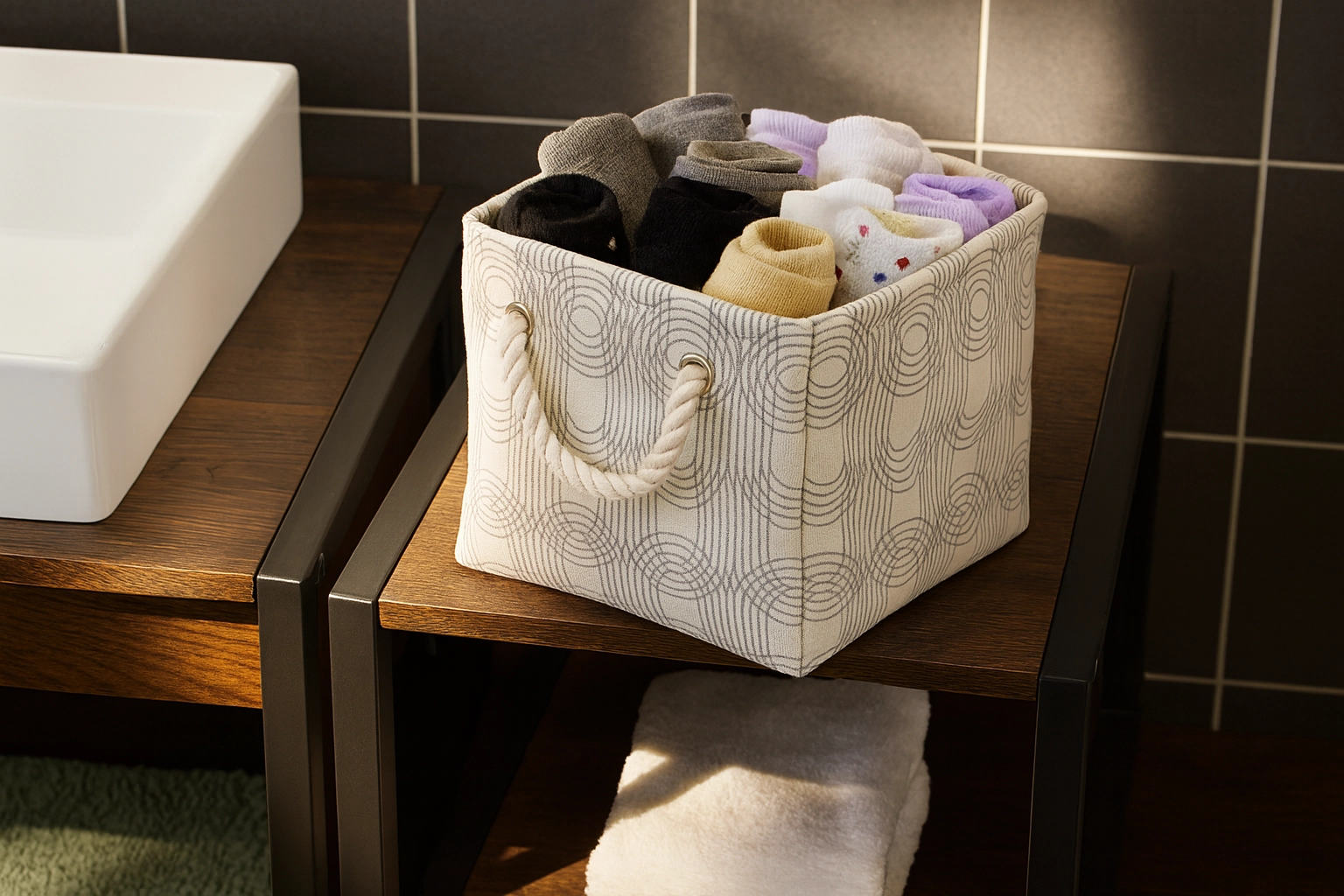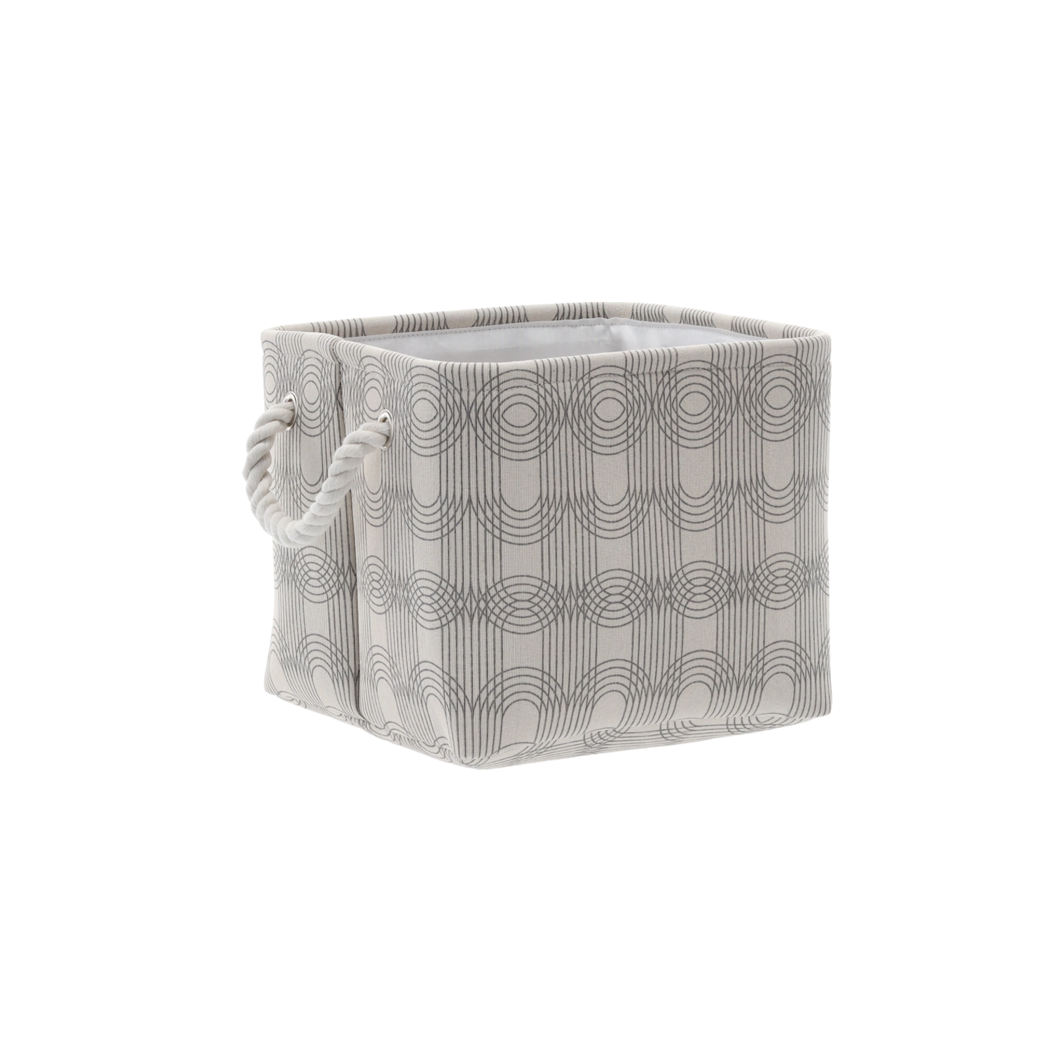 Neutral beige–gray tones and a subtle geometric pattern pair easily with modern and Scandinavian styles. The basket looks clean and organized on a shelf, in the bathroom, or in a workspace.