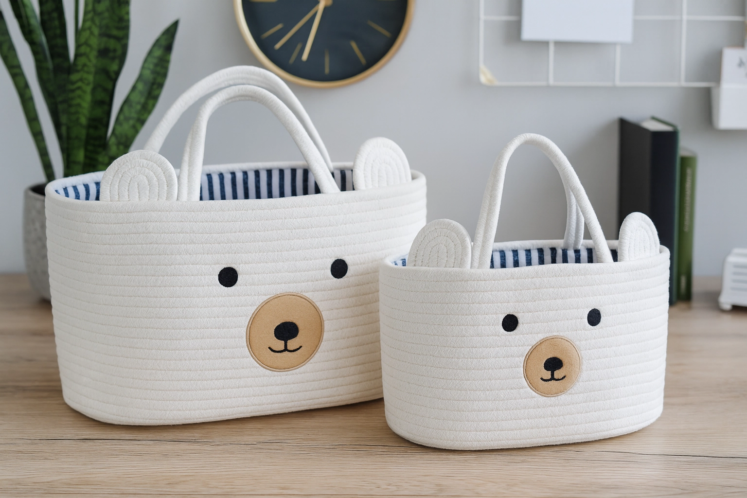 Looking for a stylish and functional way to store toys, clothes, or small items? This white basket with a cute bear motif combines a practical storage space with a decorative design. Thanks to the two sturdy handles, it’s easy to carry between rooms, and its structured sides keep their shape.