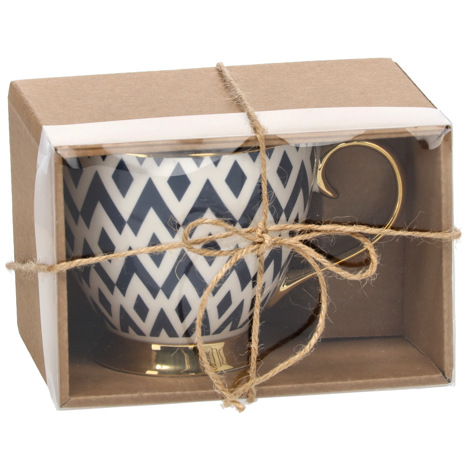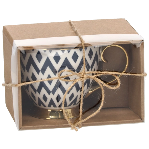 The mug is made of high-quality porcelain, which is durable and easy to maintain. The ergonomic handle and stable foot ensure comfortable use and secure placement on the table. The varied geometric patterns give the product a unique character, making it a perfect gift idea.