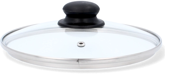 Universal 20 cm glass lid made of durable tempered glass, ideal for everyday cooking. Offers heat resistance, a practical steam vent to release excess steam, and a sturdy plastic knob for safe handling. The stainless inner rim prevents condensed steam from dripping outside the pot.