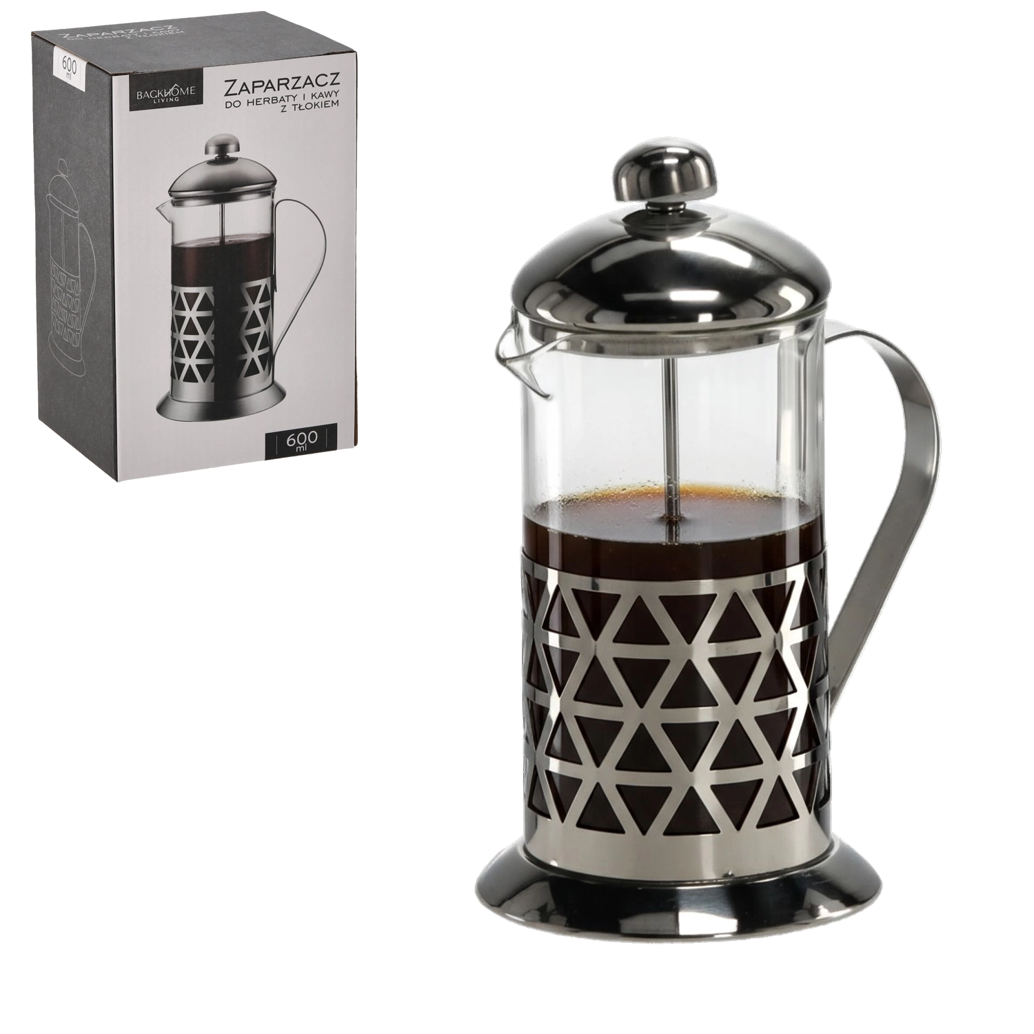Elegant 600 ml French press for preparing coffee, tea, and herbal infusions. The combination of durable borosilicate glass and stainless steel ensures long life and a pure taste. Thanks to the ergonomic handle, practical pour spout, and fast plunger mechanism, you can make your drink without spills or waiting. Also great for frothing milk and preparing iced coffee with foam.