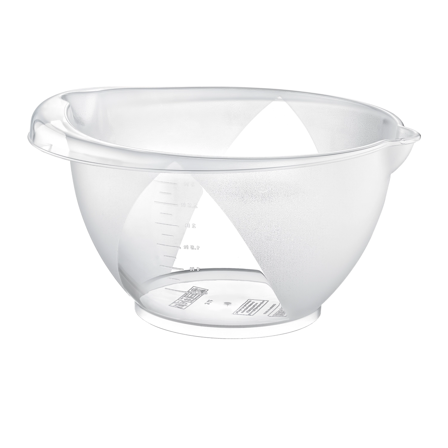 A practical transparent 3-liter bowl ideal for everyday mixing, whipping, and blending. Thanks to its height and ergonomic shape, it minimizes splashing, while the integrated 0.5–3 L measuring scale ensures precise dosing. A spout and comfortable handle make pouring easy, the BPA-free plastic is food-safe, and the bowl is dishwasher safe.