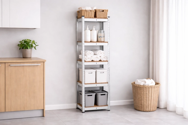 Maximize storage space with this practical 5-level rack measuring 180 × 40 × 40 cm. The galvanized (zinc-coated) steel frame ensures corrosion resistance, while the durable MDF shelves reliably hold heavier items. Rounded edges enhance safety during everyday use.
