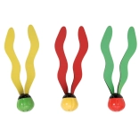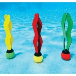 A fun set of diving toys for kids aged 6+ that supports swimming and diving practice. Once thrown into the water, the toys stand upright on the pool floor thanks to a weighted base, serving as colorful targets to retrieve. They are made of soft plastic with fabric ribbons and come in 3 bright colors for great visibility underwater.