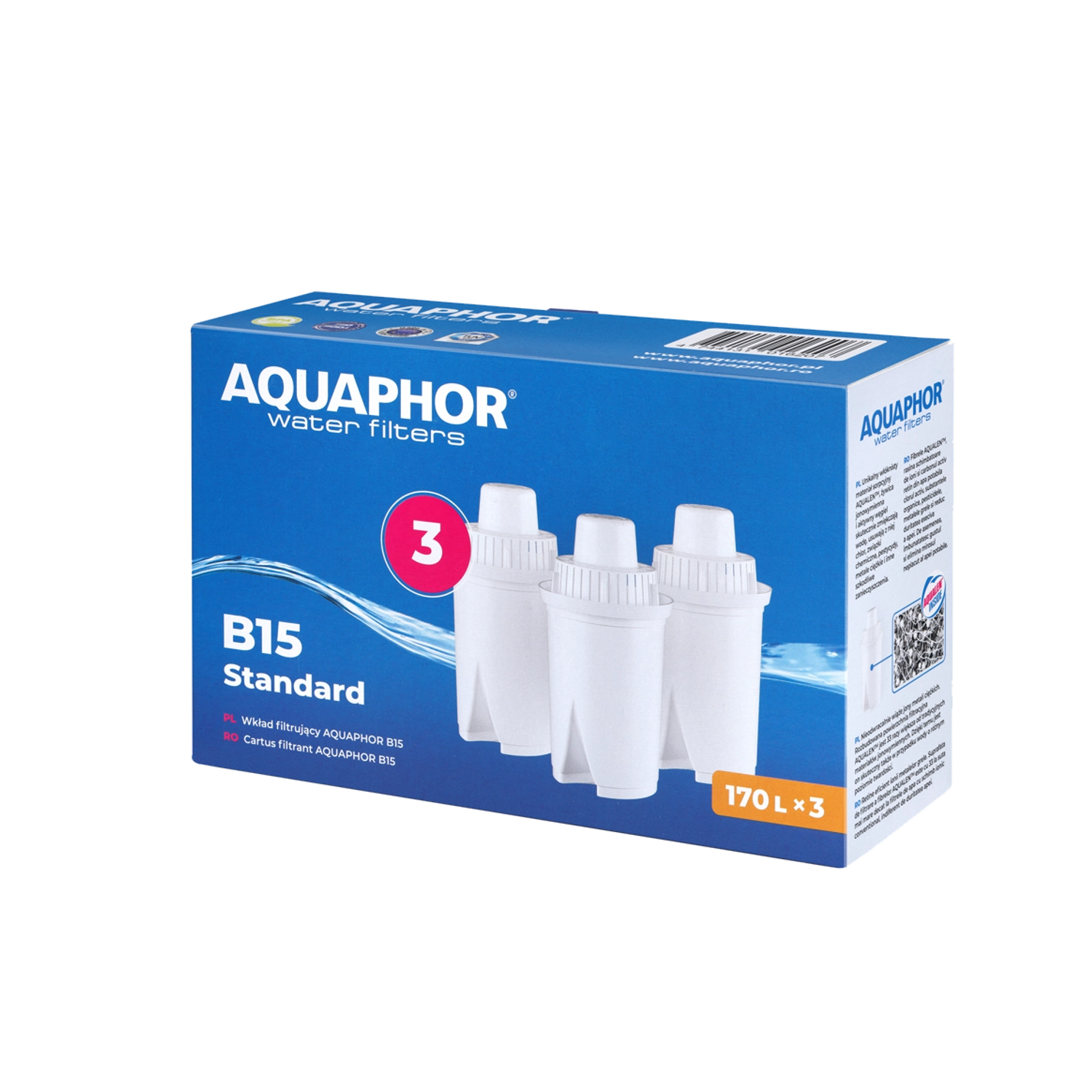 The universal set of three AQUAPHOR B15 Standard filter cartridges ensures clean and great-tasting tap water for the whole family. Thanks to Aqualen™ fiber, it effectively removes chlorine, heavy metals, pesticides, and phenols, improves the color, taste, and smell of water, and helps reduce limescale buildup in kettles and coffee makers. Each cartridge has a capacity of up to 170 L and is compatible with a wide range of pitchers with a round cartridge.