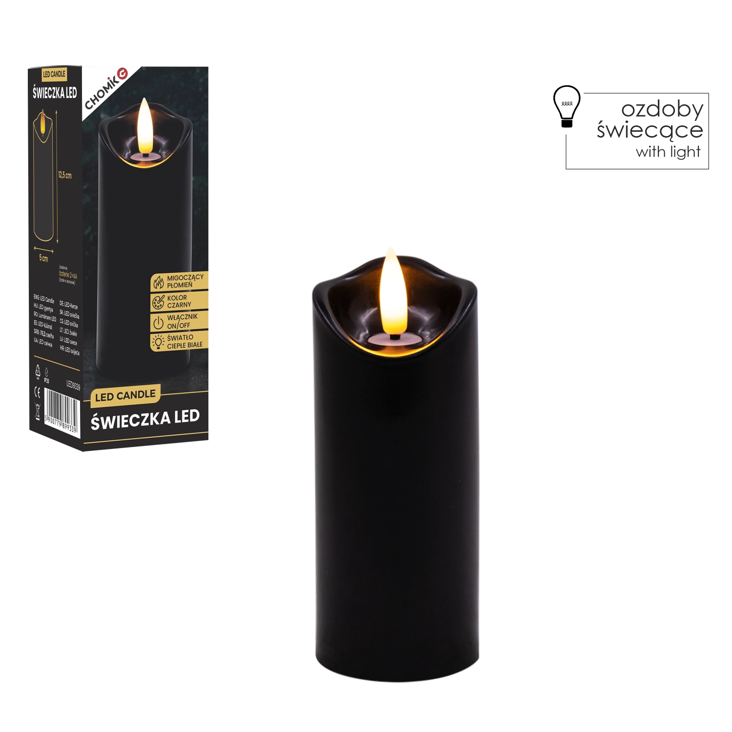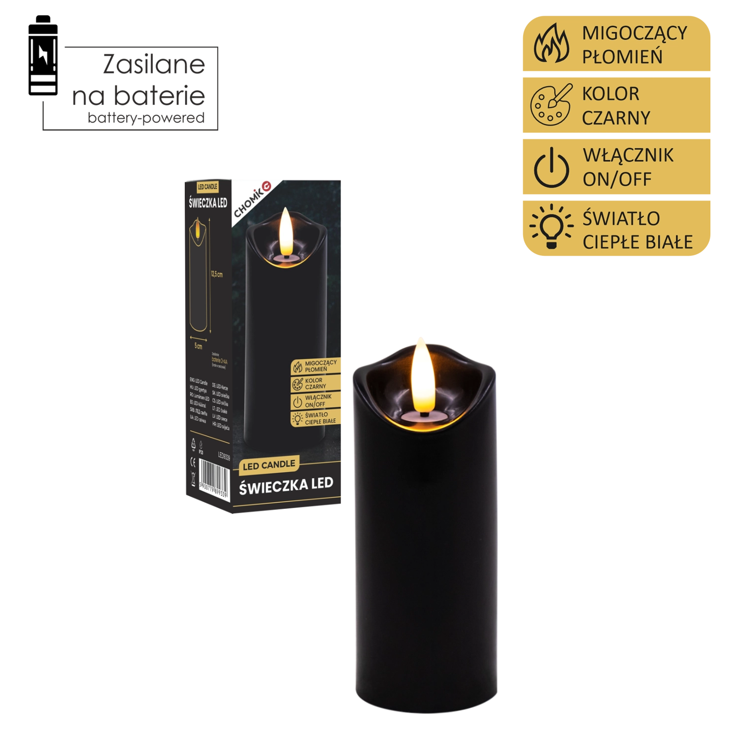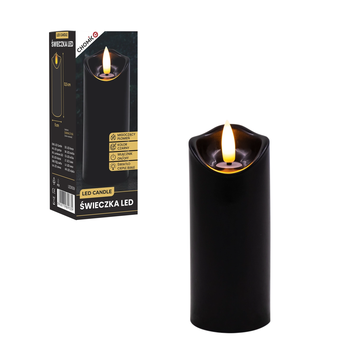 Create pleasant light anytime, anywhere. This black LED candle measuring 5 × 12.5 cm glows warm white and thanks to the realistic flicker of the flame faithfully imitates a real candle—without mess, odor, or the risk of an open flame.