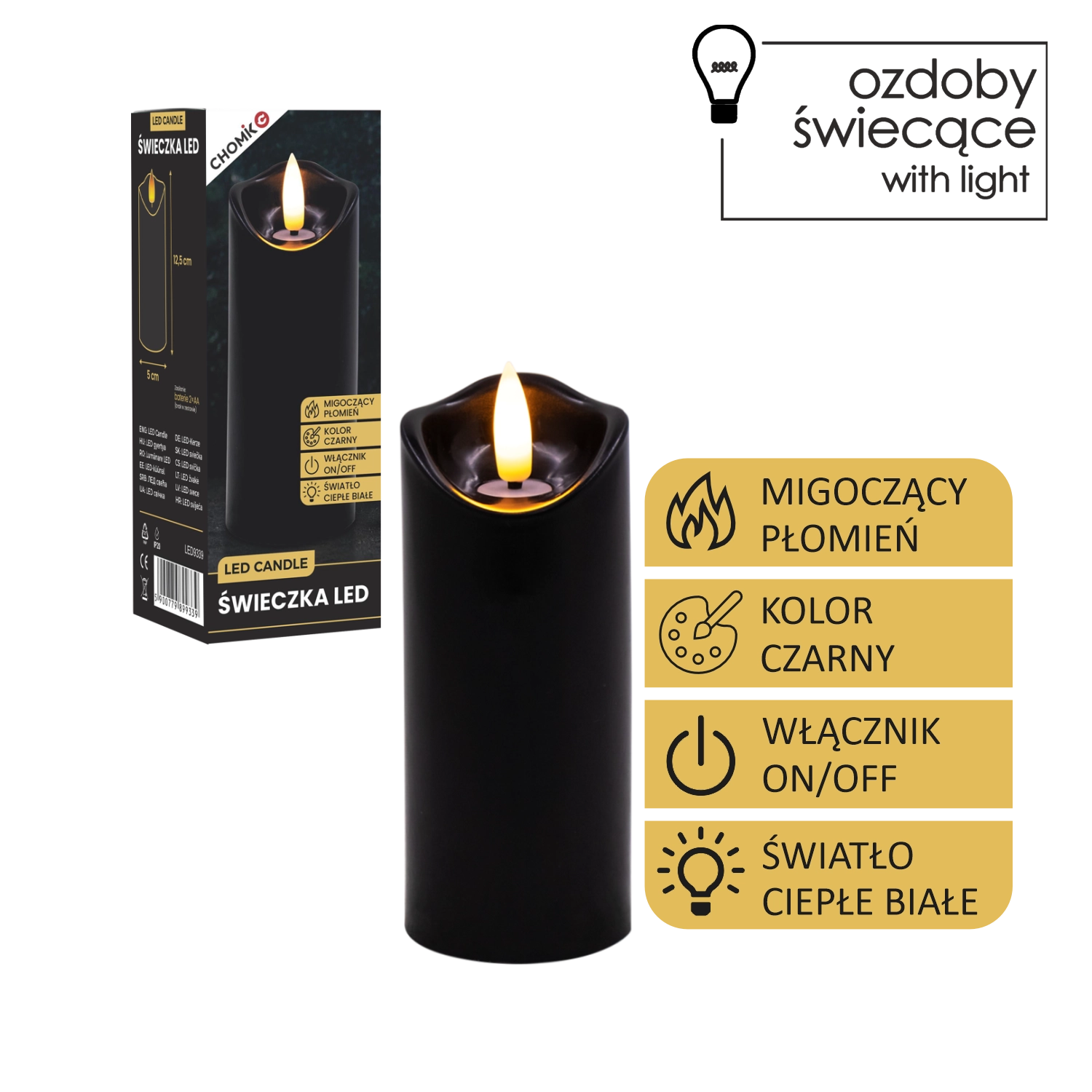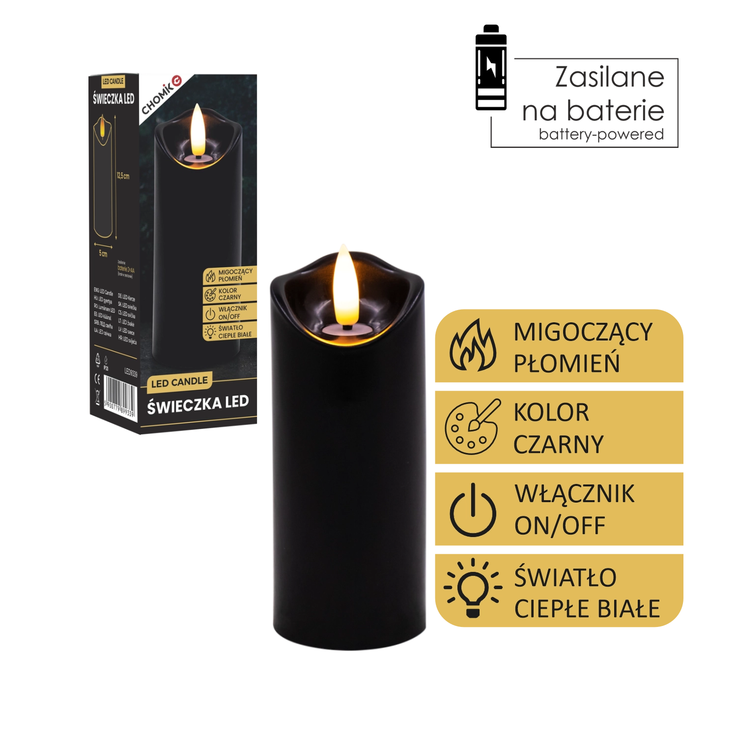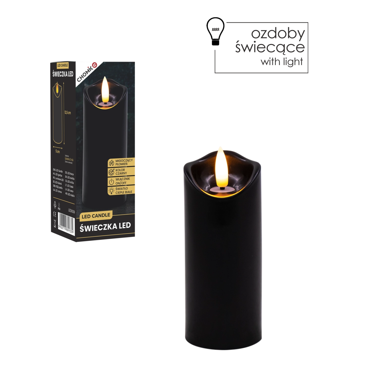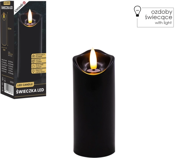 Create pleasant light anytime, anywhere. This black LED candle measuring 5 × 12.5 cm glows warm white and thanks to the realistic flicker of the flame faithfully imitates a real candle—without mess, odor, or the risk of an open flame.