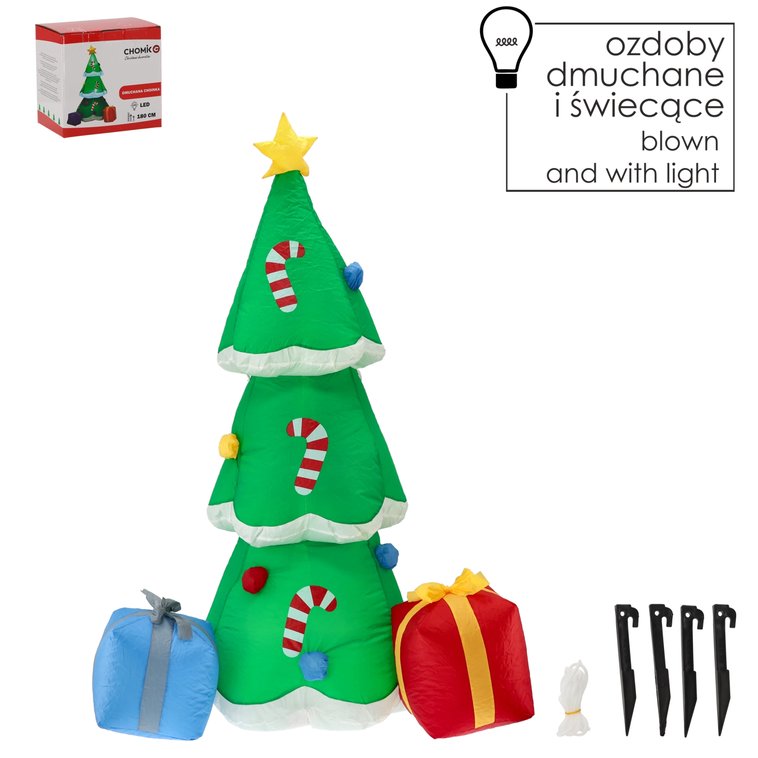 Add a striking centerpiece decoration to your Christmas. The colorful inflatable tree with a star and gifts around it captures the attention of children and adults alike, both indoors and outdoors. Just plug it into a socket—the built-in motor provides automatic inflation and the LED lighting creates a cozy atmosphere all evening.