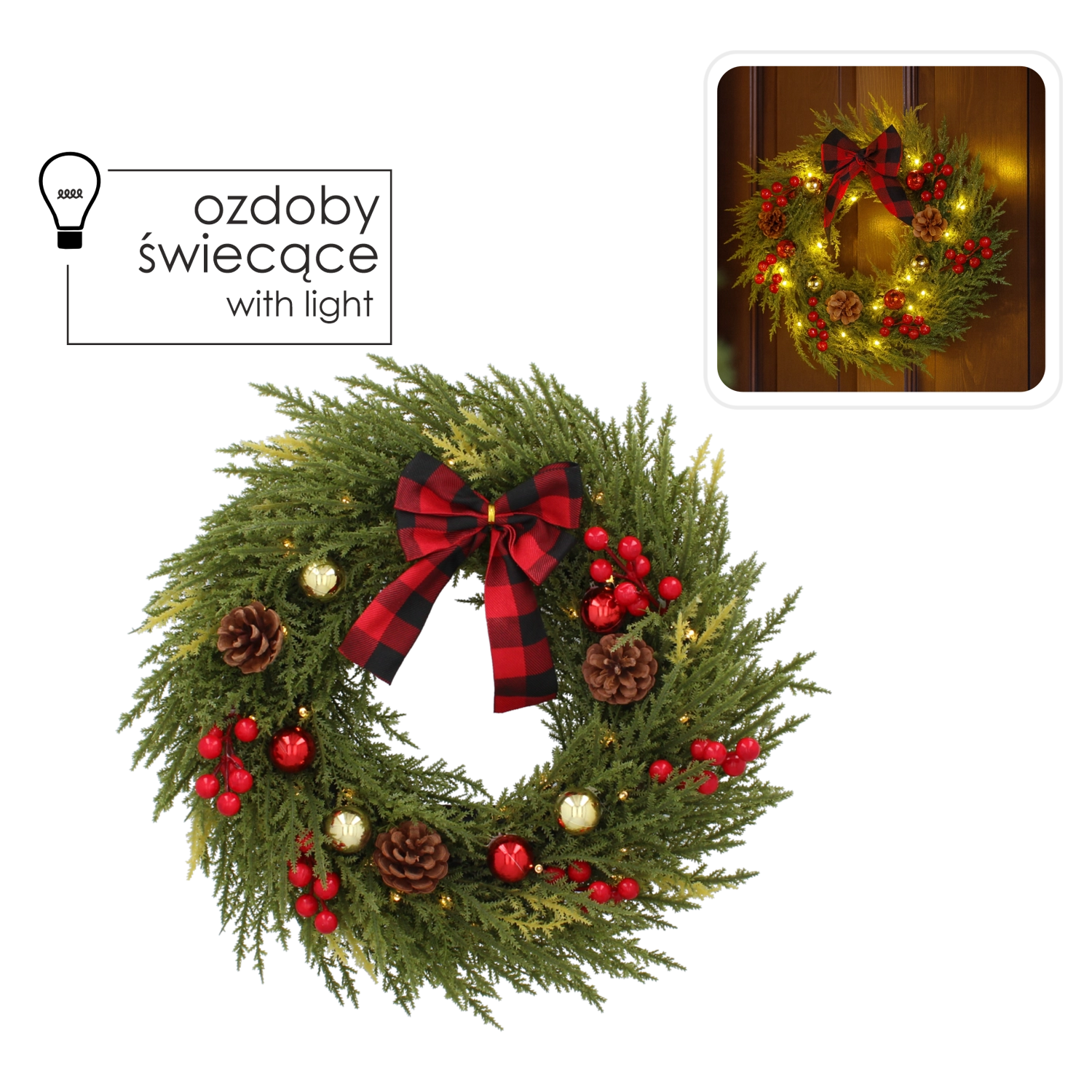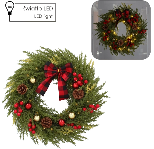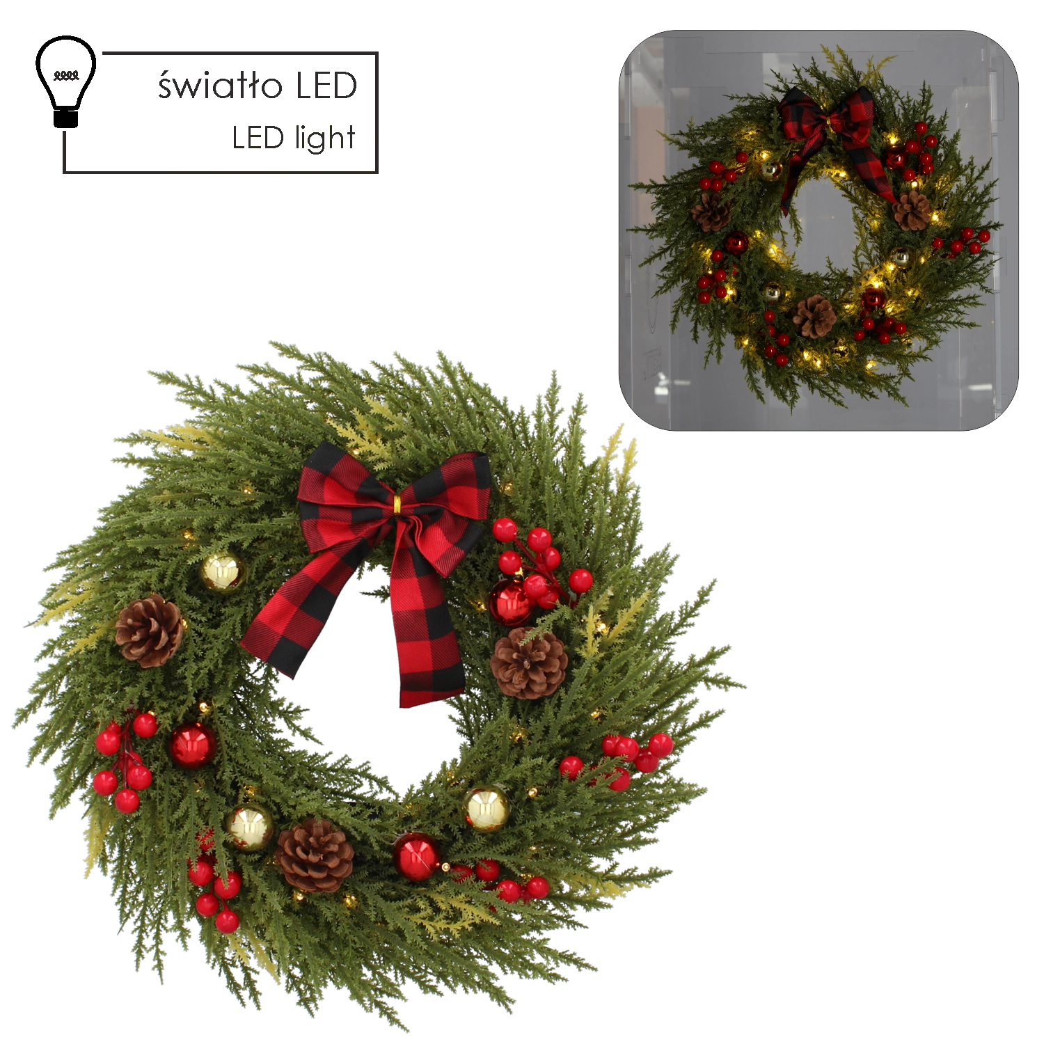 This elegant Christmas LED wreath brings a cozy home atmosphere thanks to its warm white light and lush, realistic pine look accented with decorative elements such as berries, cones, and a stylish plaid bow. Powered by 3× AA batteries, it’s easy to place on doors, walls, or windows without visible cables.