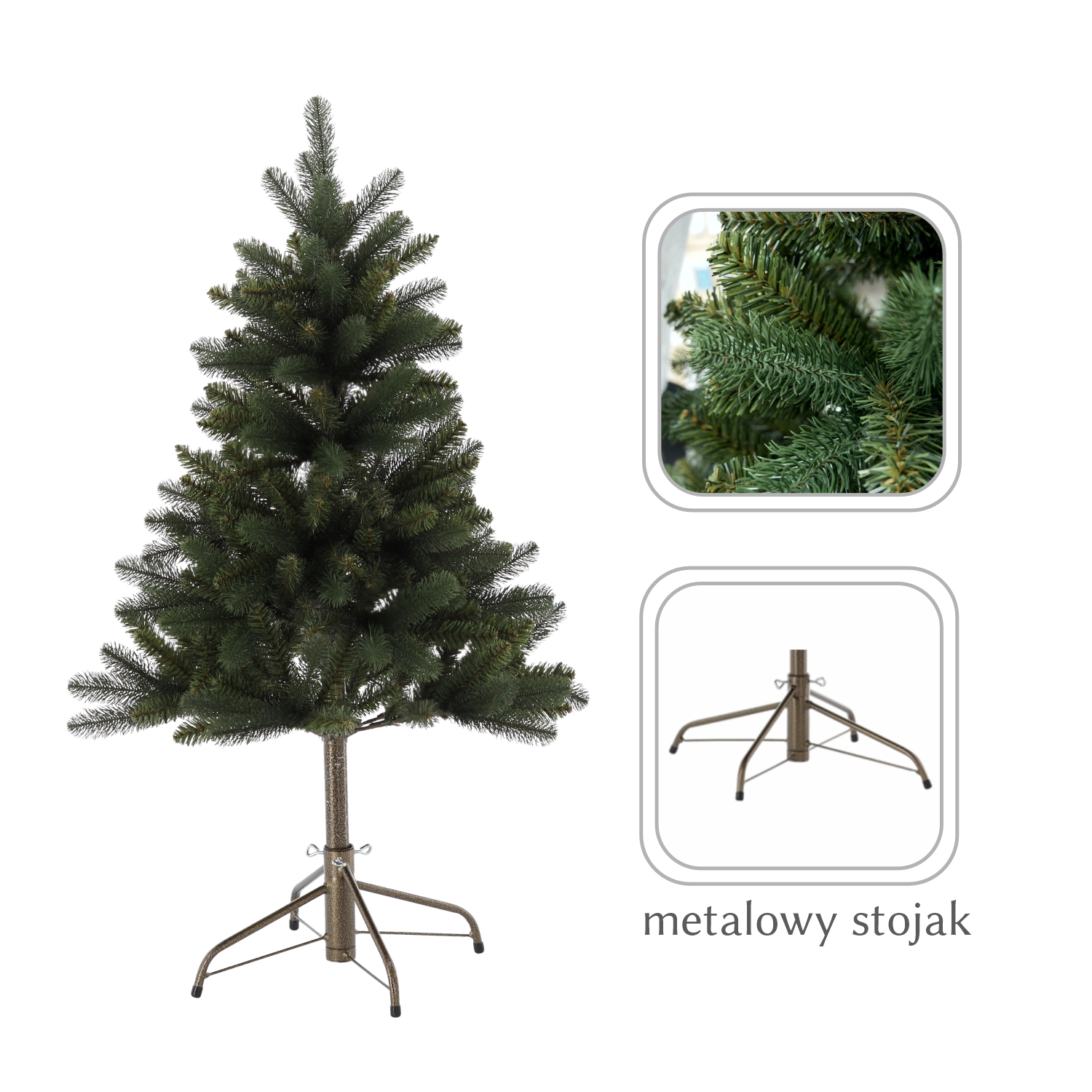 The Synthetic Christmas Tree Aurora, 120 cm tall, delivers the look of a classic fir in a practical design. Densely set branches faithfully mimic natural needles, so the tree looks lush even without excessive decorations. The high-quality PVC material makes it durable and reusable, saving time, money, and the environment.