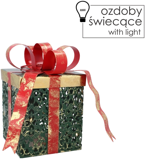 This metal gift-shaped decoration is a perfect choice to complete your Christmas decor. Thanks to the warm white LED light, it creates pleasant evening illumination that sets a calm and harmonious atmosphere. The minimalist design is complemented by an eye-catching red bow that underscores the festive character.