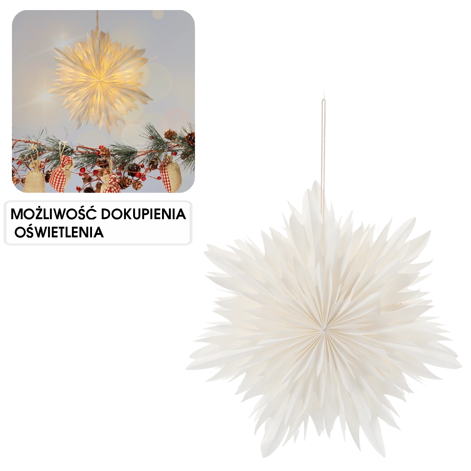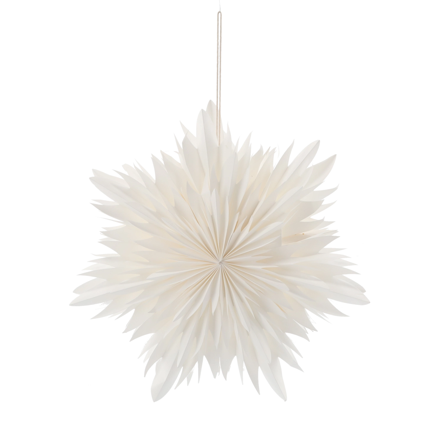 Discover pure elegance in the form of a white paper star that instantly makes any space feel cozier. The lightweight paper with a thoughtfully folded design creates a bold 3D effect and reflects light beautifully. Ideal for hanging in a window, above a table, or in a shop display.