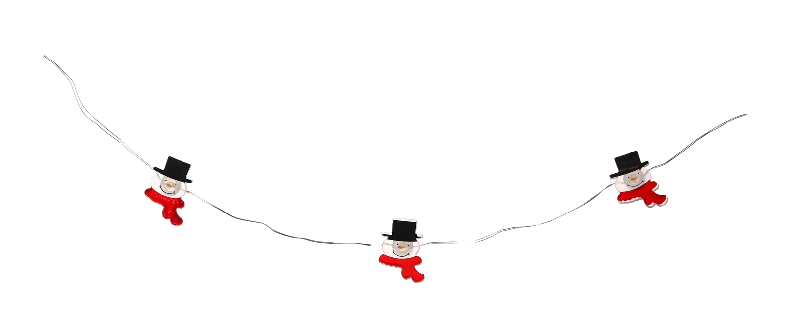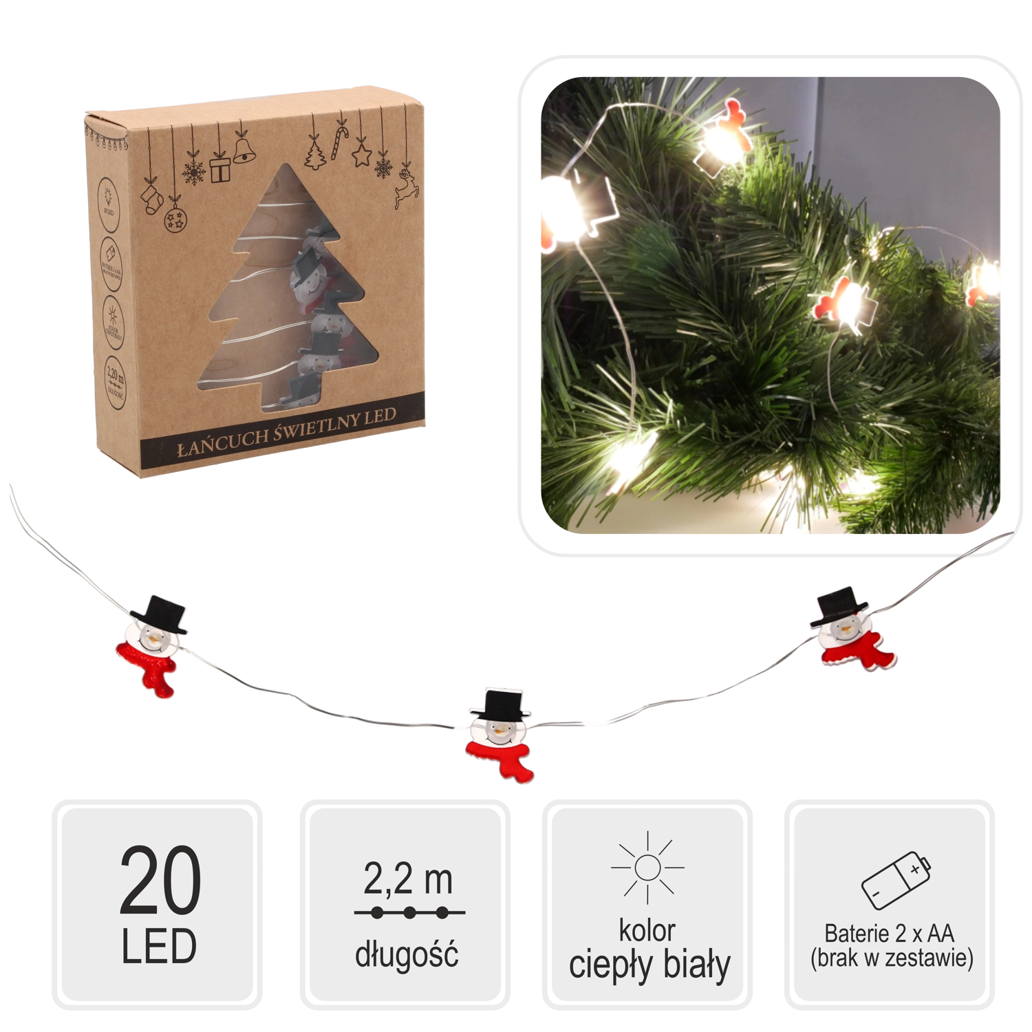 Brighten winter evenings with a playful string of lights featuring snowmen. It offers 20 warm white LEDs on a clear cable, battery power for free placement without a socket, and decorative lighting ideal for the tree, windowsill, or wreath.