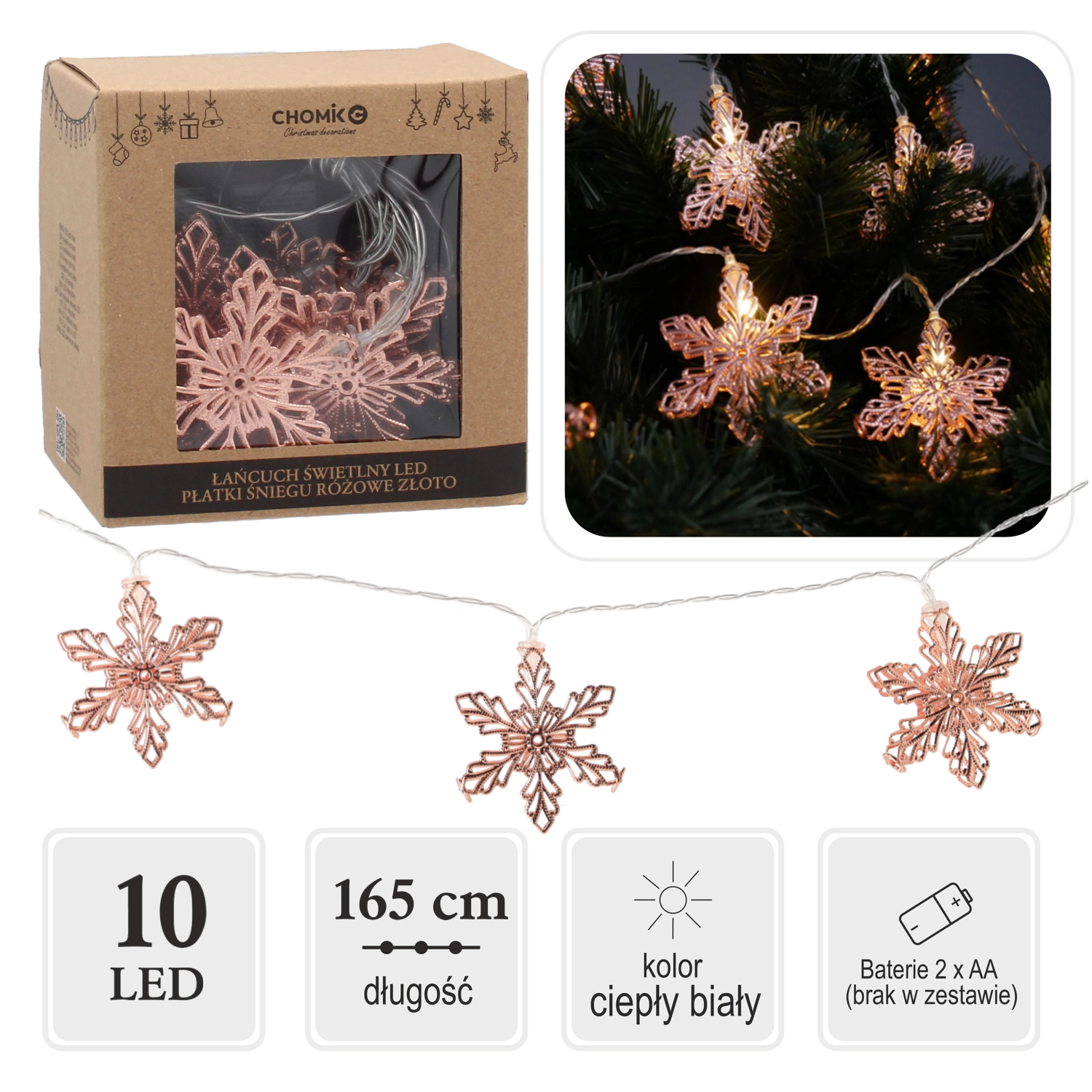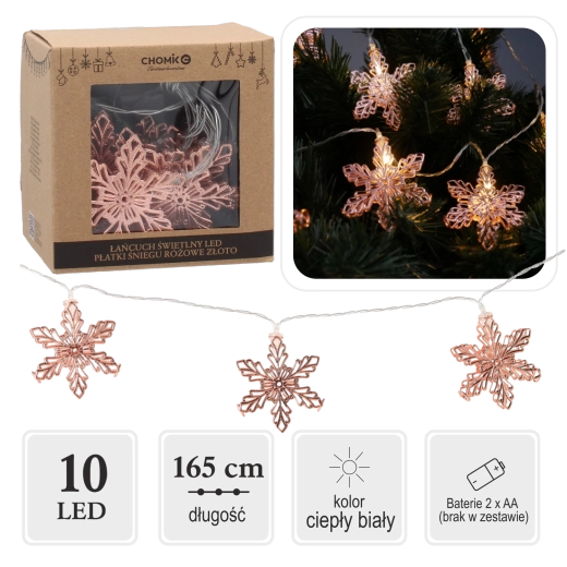 Enchant your interior with the gentle shimmer of rose gold snowflakes. This decorative string with 10 LEDs delivers a pleasant warm white glow, perfect for the living room, bedroom, or a festive table. Thanks to battery power, you can place it anywhere—no outlet and no visible cords.