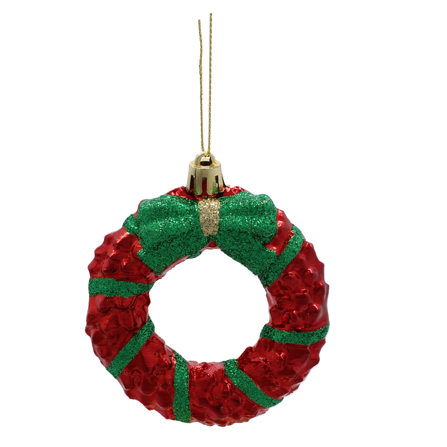 Wreaths in red and green with glitter stripes and a bow bring a bold color accent and a festive atmosphere to your decor.