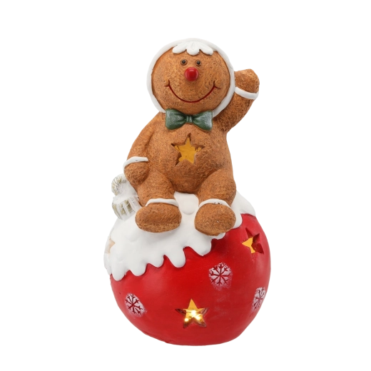 A cute Christmas decoration featuring a gingerbread man sitting on a decorative bauble brings a magical atmosphere to your home. The integrated LED lighting creates a warm effect, while the durable magnesite ceramic material ensures stability and long service life. Ideal as holiday decor for a shelf, sideboard, or windowsill.