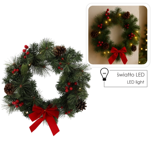 Bring the magic of Christmas into your home with a timeless 40 cm wreath. The integrated 15 warm white LEDs create pleasant lighting that beautifully highlights the red and gold ornaments, natural pinecones, and decorative ribbon.