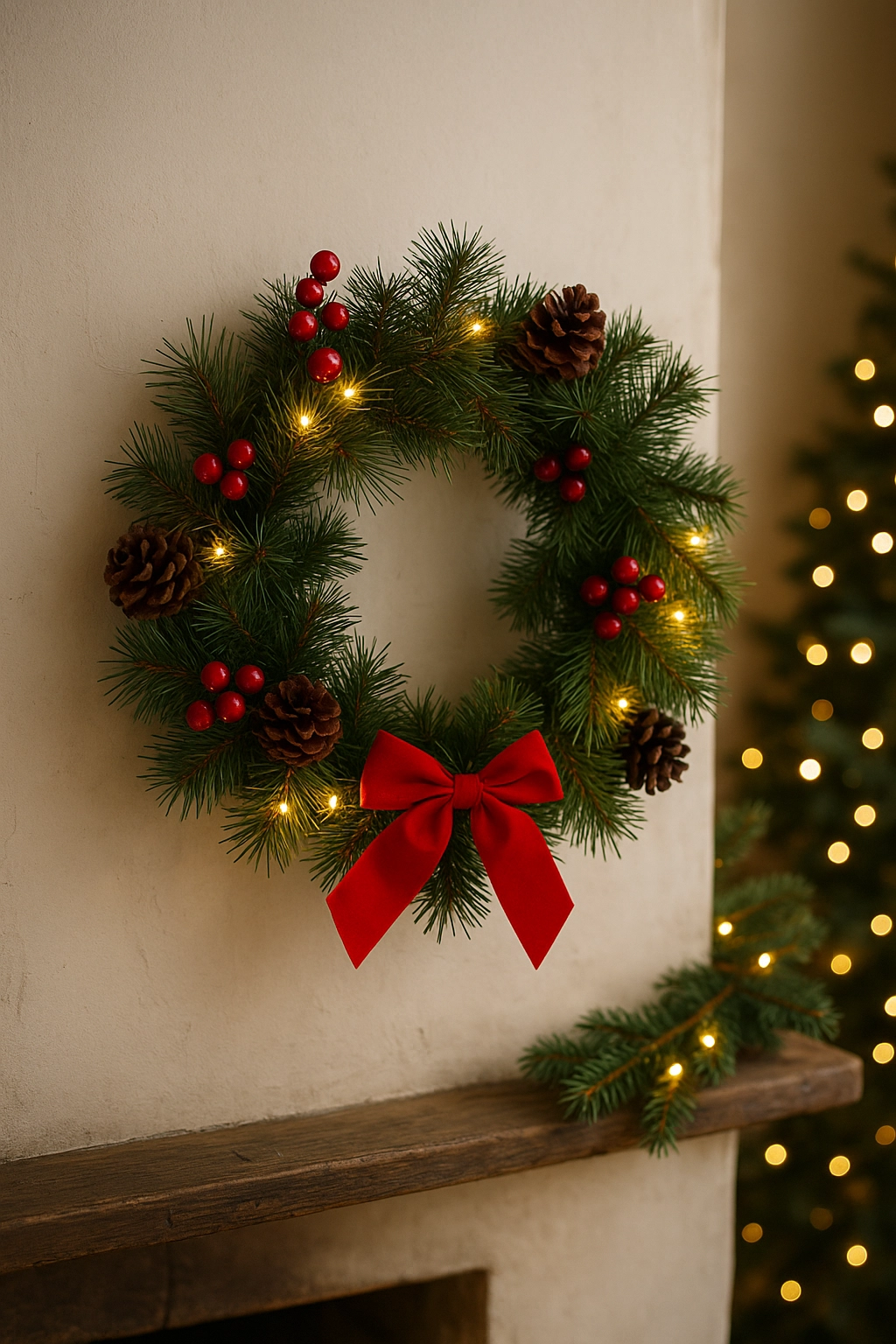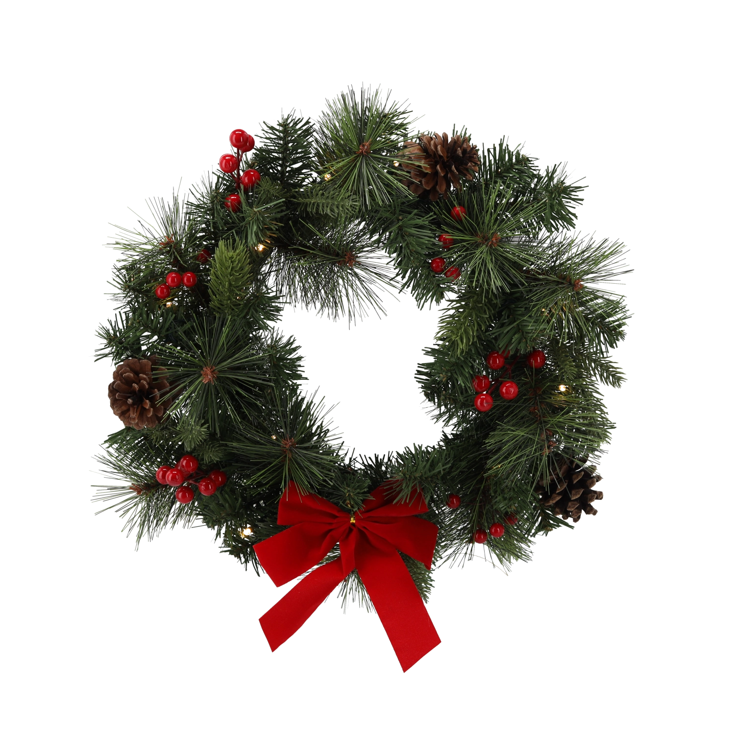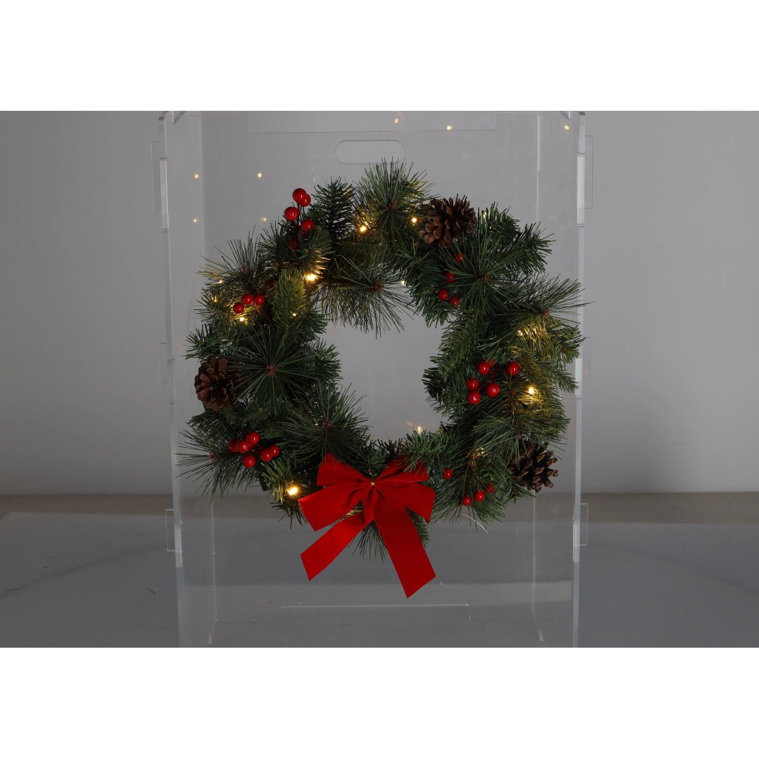 The integrated 15 warm white LEDs evenly illuminate the wreath and highlight the ornaments, pinecones, and ribbon — ideal for peaceful evening moments.