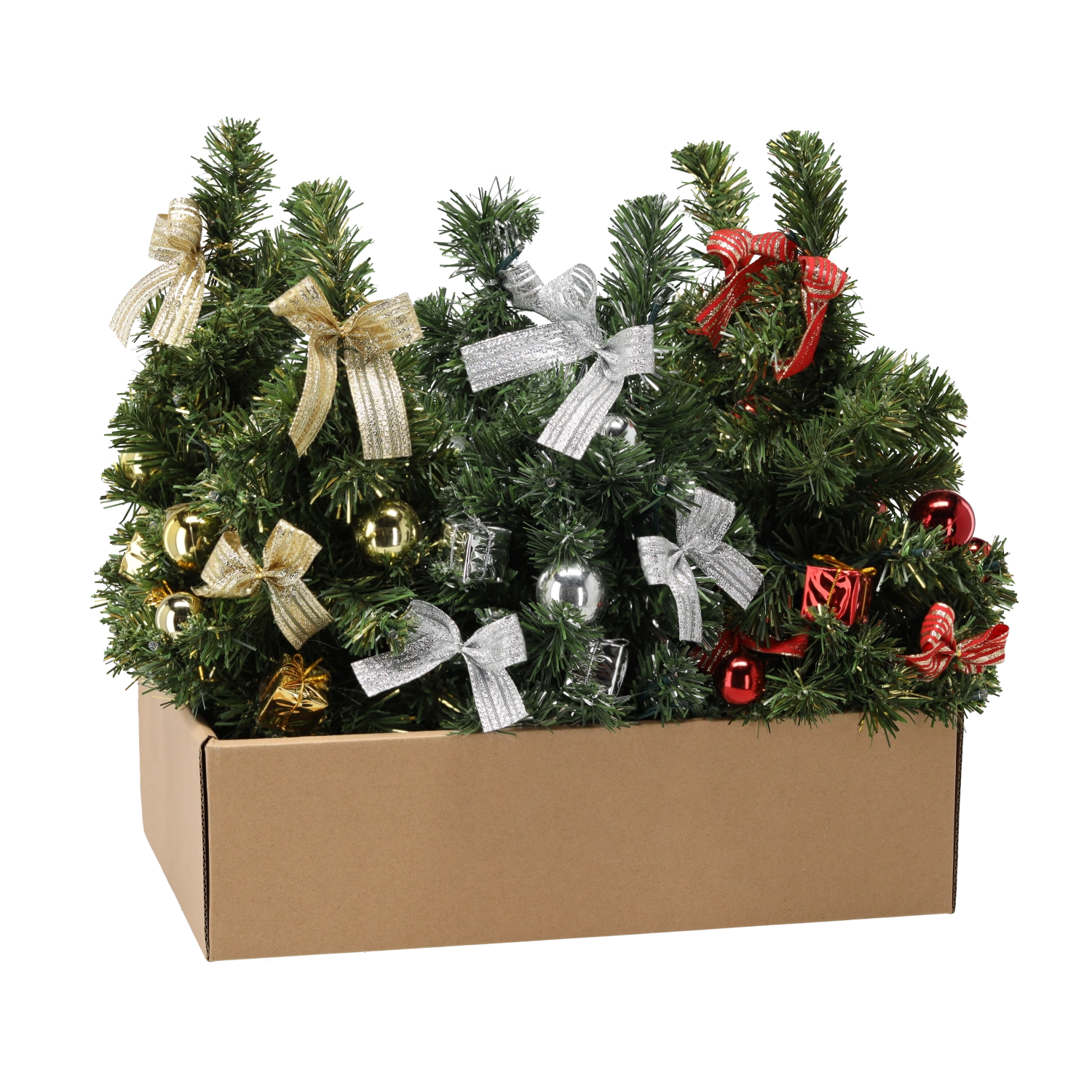 The tree is finished with ribbons and baubles in red, silver, or gold tones — just unpack and display.