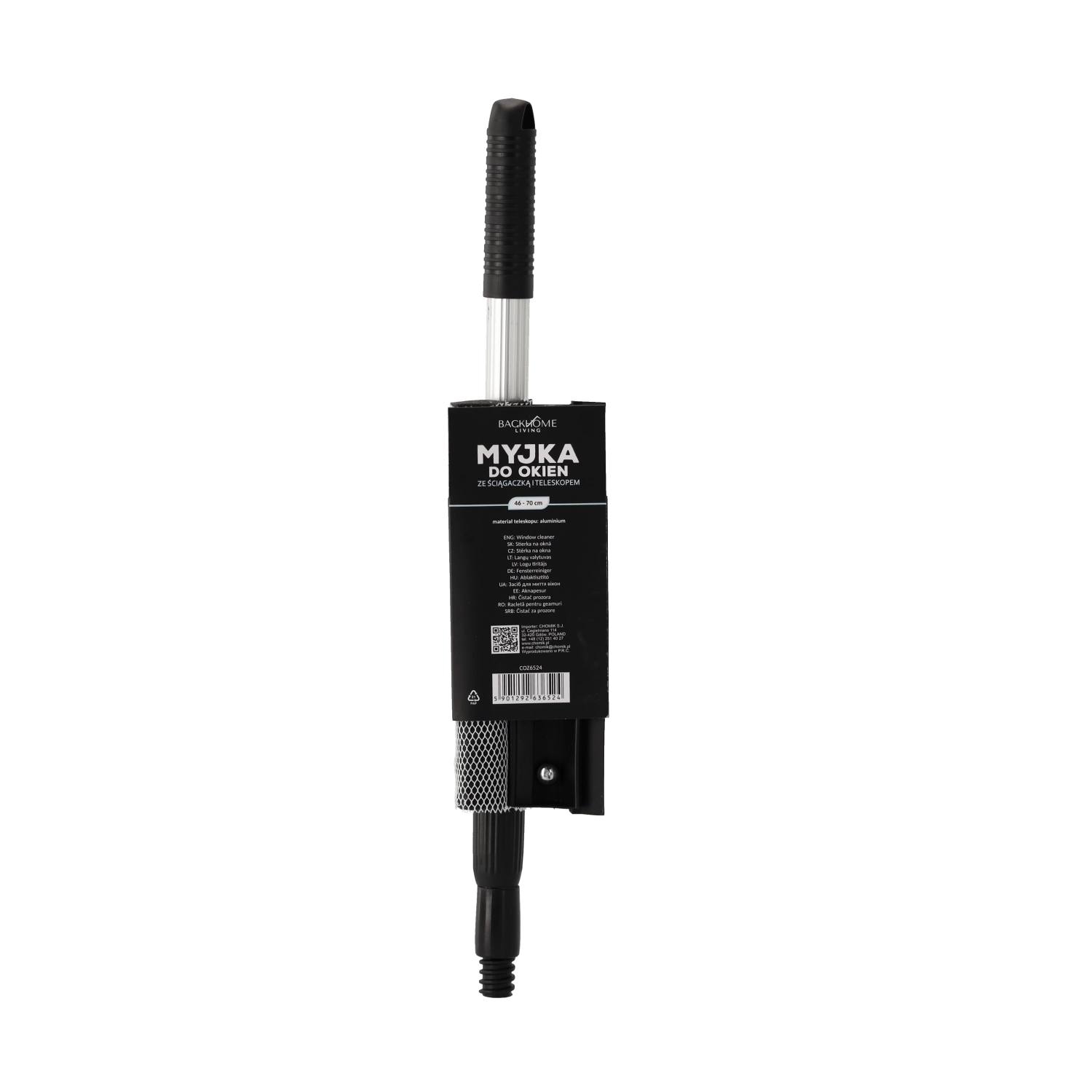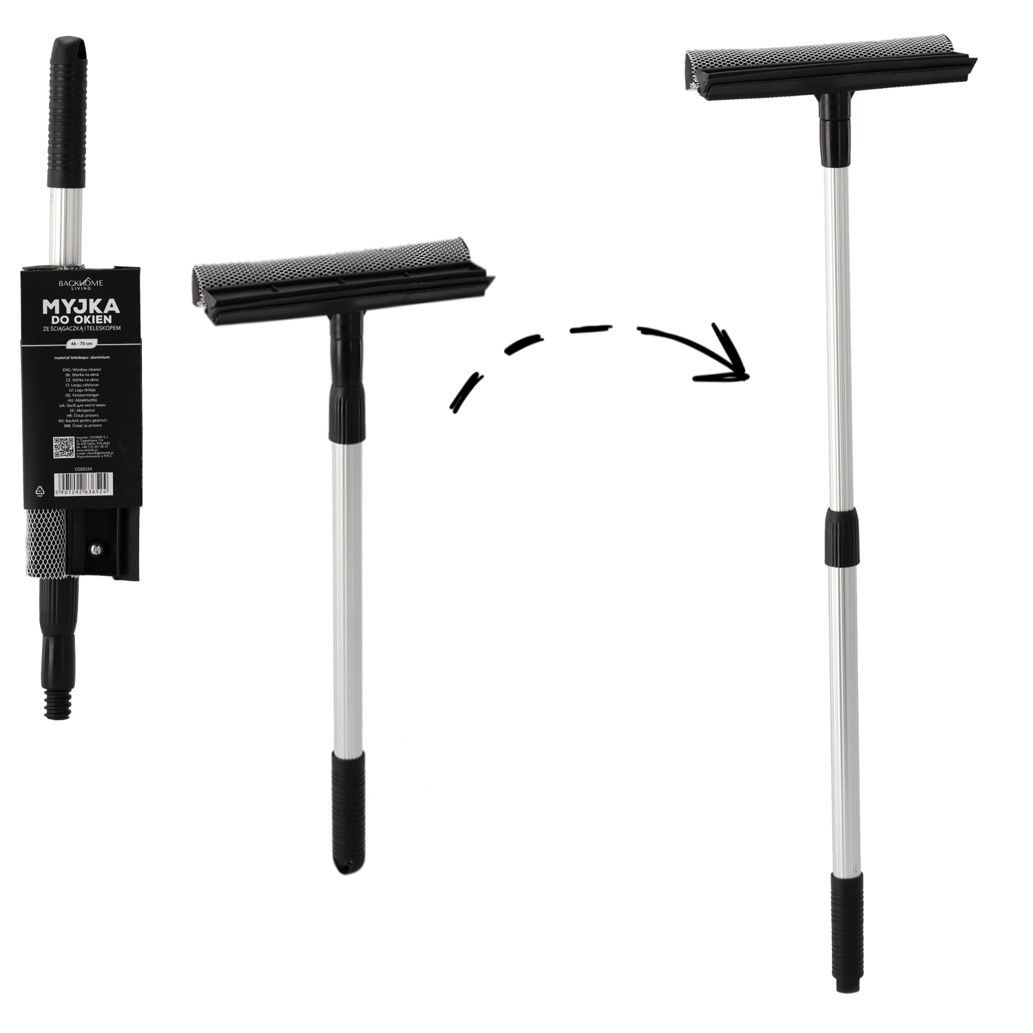 A practical telescopic window washer with a combined head for washing and wiping ensures fast, streak-free cleaning of windows, mirrors, and glass. The lightweight aluminum handle with an adjustable length of 46–70 cm makes it easy to reach high areas without a ladder, while the rubber squeegee and mesh-covered sponge reliably remove water and dirt. An ergonomic, non-slip grip enhances comfort during use.