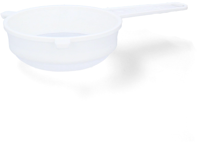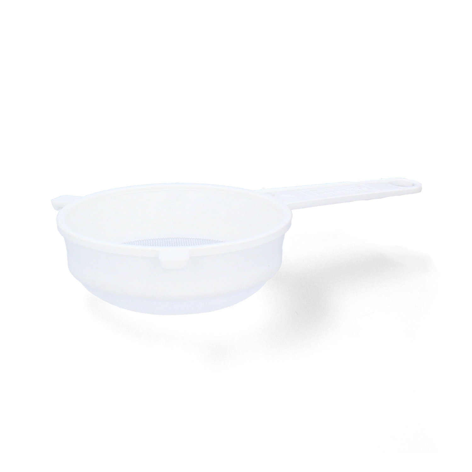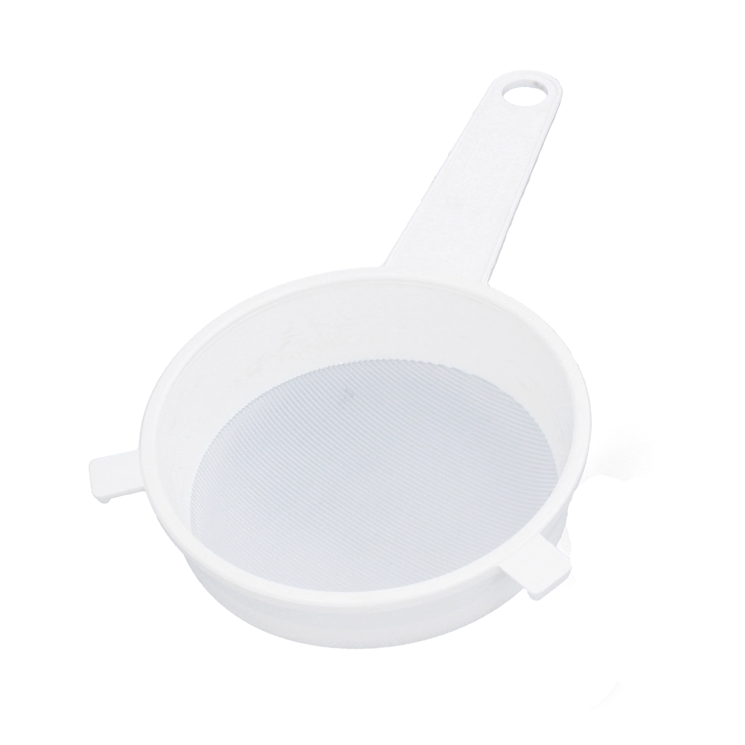 Practical kitchen strainer with a diameter of 12 cm for efficient liquid filtering, such as milk, wine, or homemade liqueurs. The fine mesh reliably separates solid particles and ensures clear and smooth beverages. The lightweight plastic construction is food-safe, easy to clean, and thanks to the ergonomic handle and hooks for stable placement, it is ideal for everyday use.