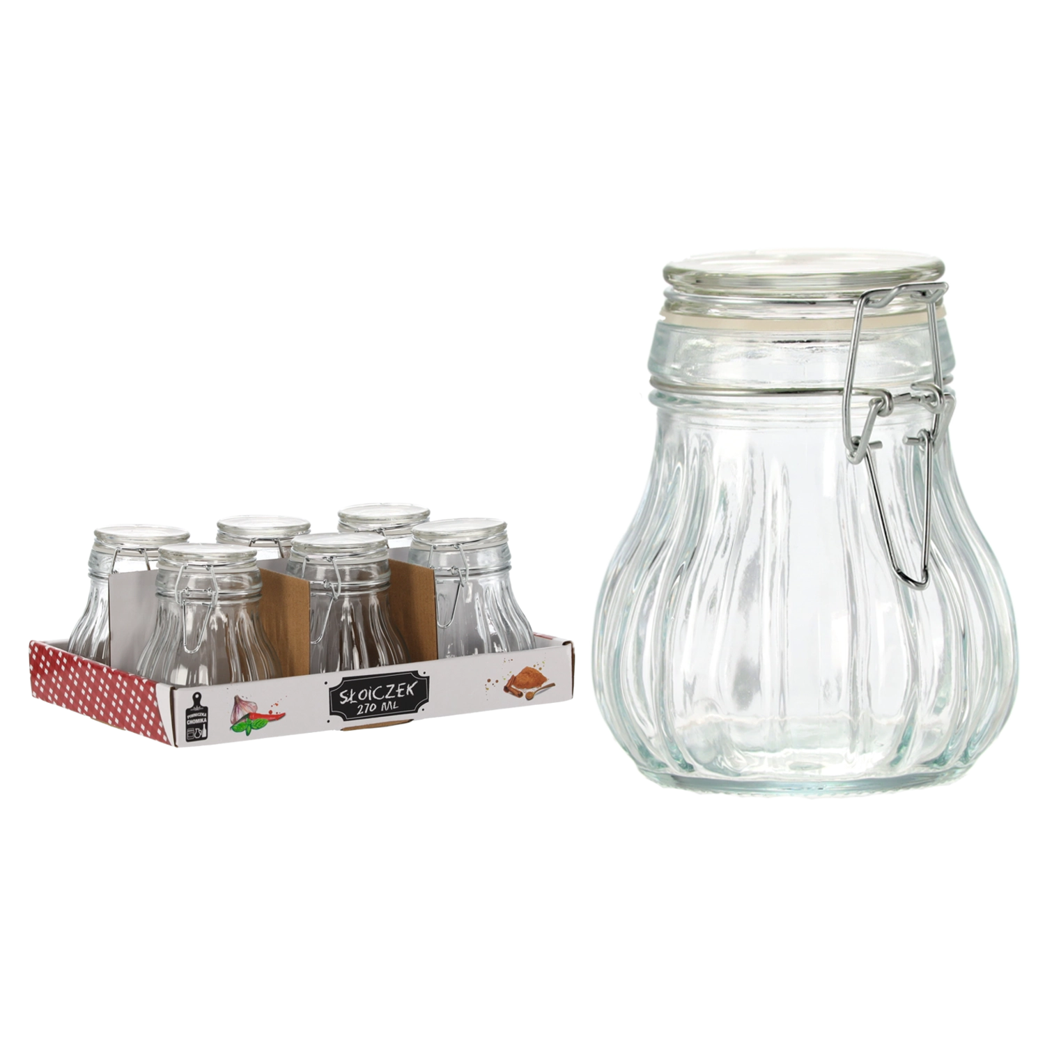 A practical and elegant 270 ml glass jar, ideal for storing spices, preserves, jams, or honey. Thanks to the transparent glass you can easily see the contents, the mechanical clasp with a metal clip ensures an airtight seal, and the silicone gasket protects food from moisture and loss of aroma.