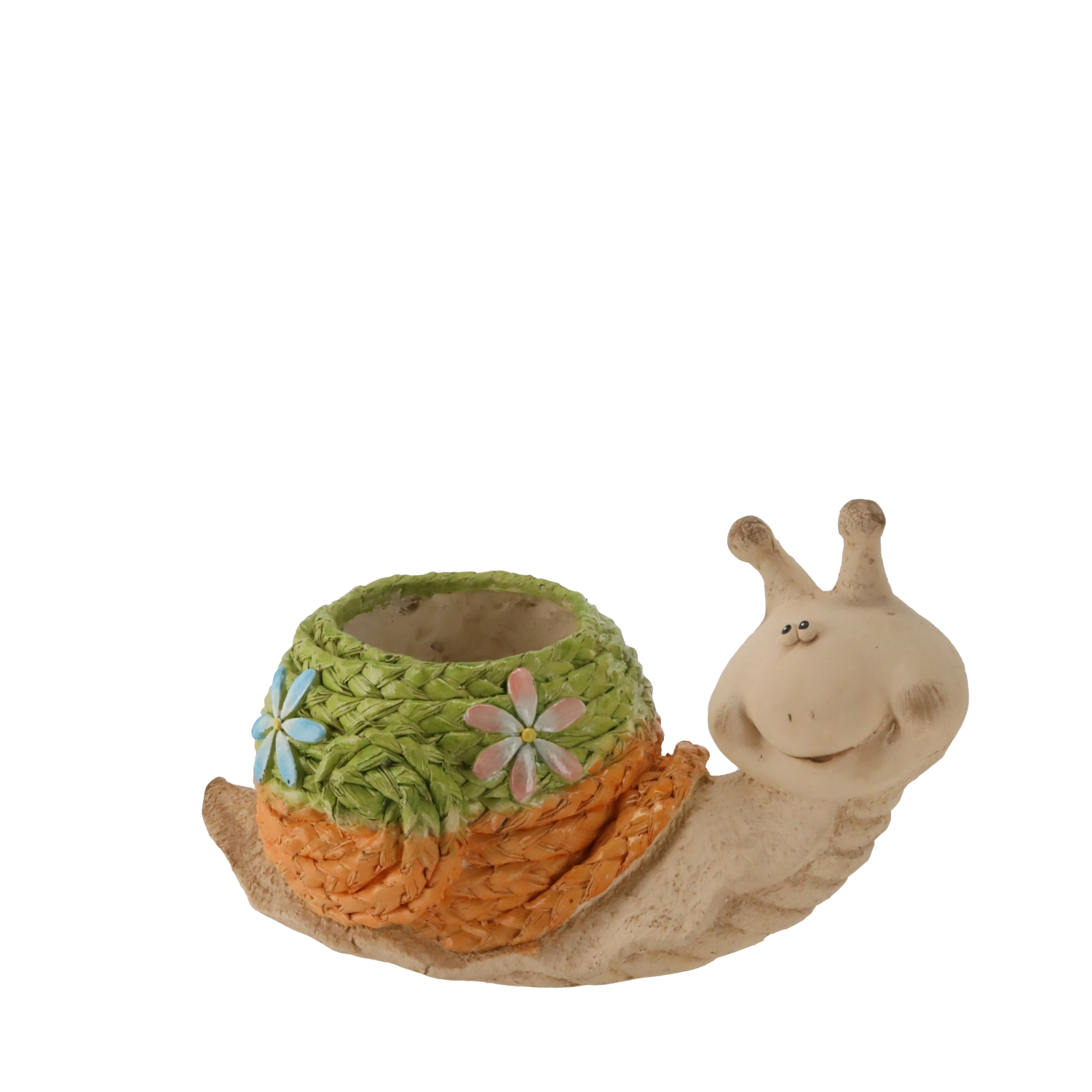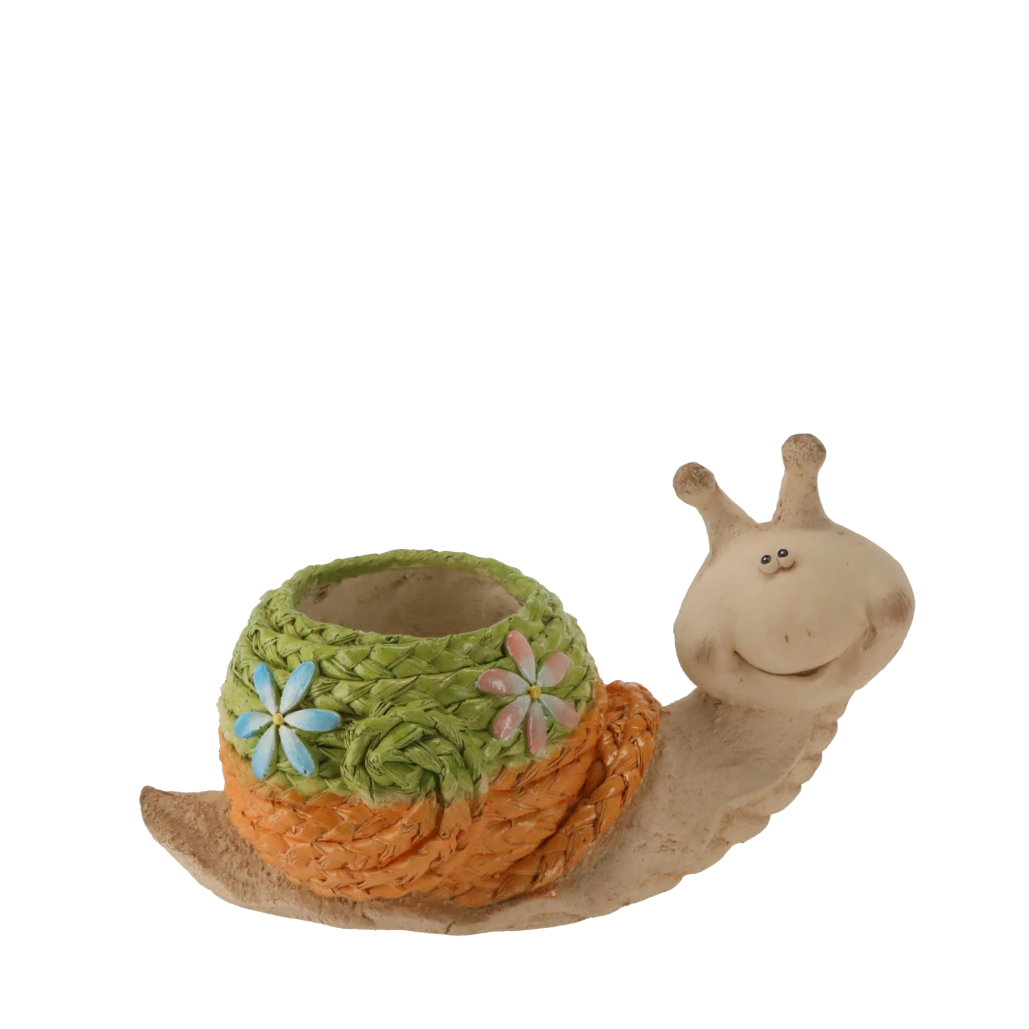 - Snail design with woven shell – a striking accent for garden, terrace, and balcony.