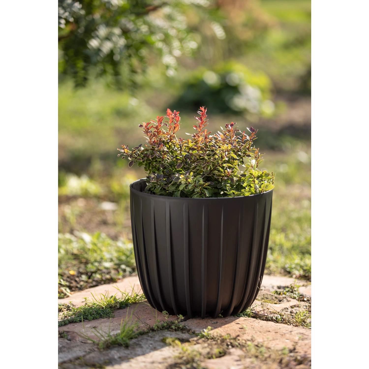 The elegant Mira flower pot in black stands out with its modern, tapered-down shape and vertical grooves that give it a unique character. It is made from 100% recycled plastic, is lightweight, scratch- and weather-resistant, and suitable for both indoor and outdoor use. Ideal for flowering and green plants.