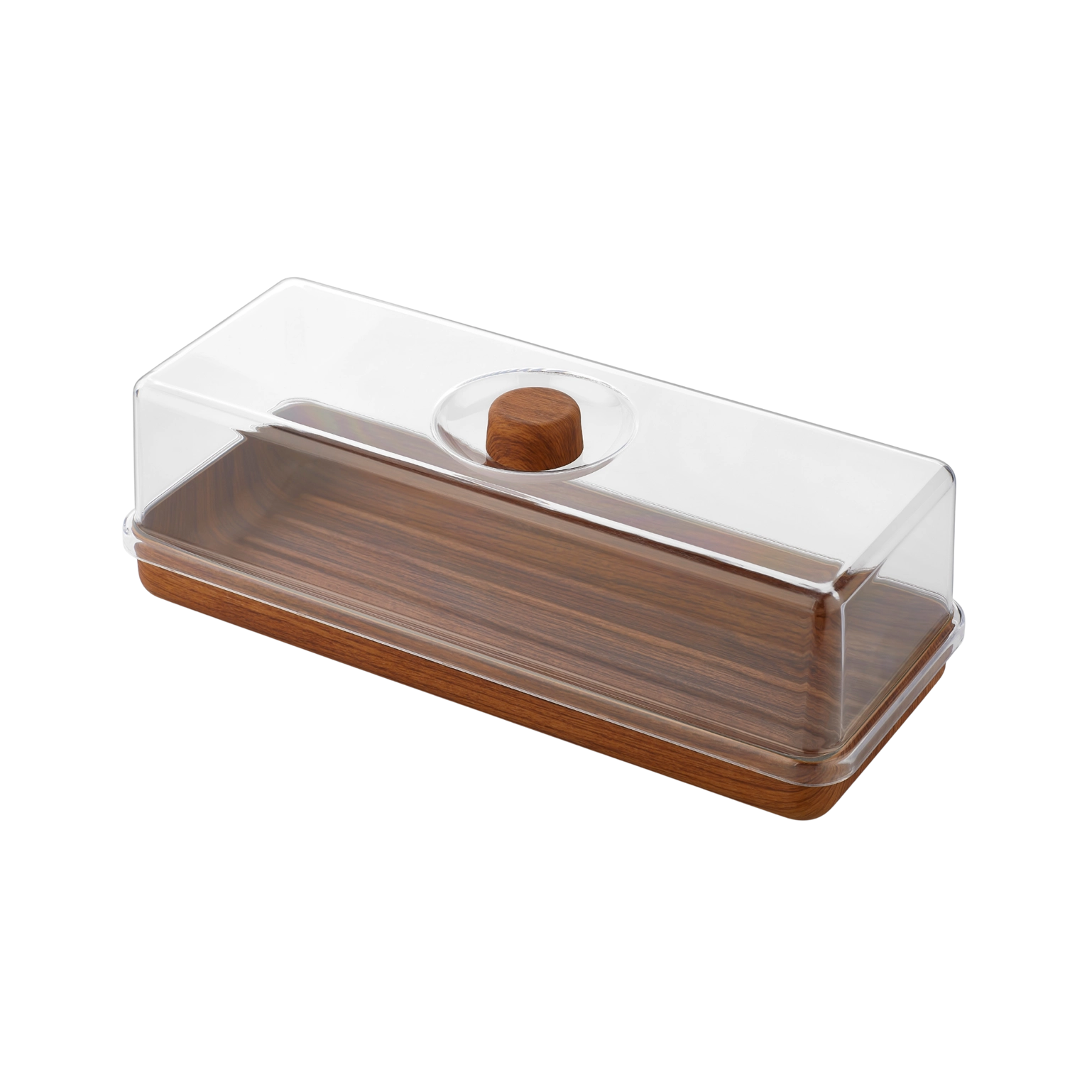A practical rectangular container for pastries and cakes keeps your treats fresh for longer. Thanks to the transparent walls, you always have an overview of the contents, while the sturdy plastic construction and stable brown (walnut) base ensure safe transport and storage.