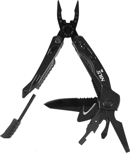 The compact NILS Camp multitool with 13 functions handles everyday fixes at home, in the garden, and on the go. It features a stainless steel build, spring-loaded pliers, a locking knife, a fire starter, a whistle, and a set of 9 bits with a magnetic bit holder. Includes a durable belt pouch for instant access.