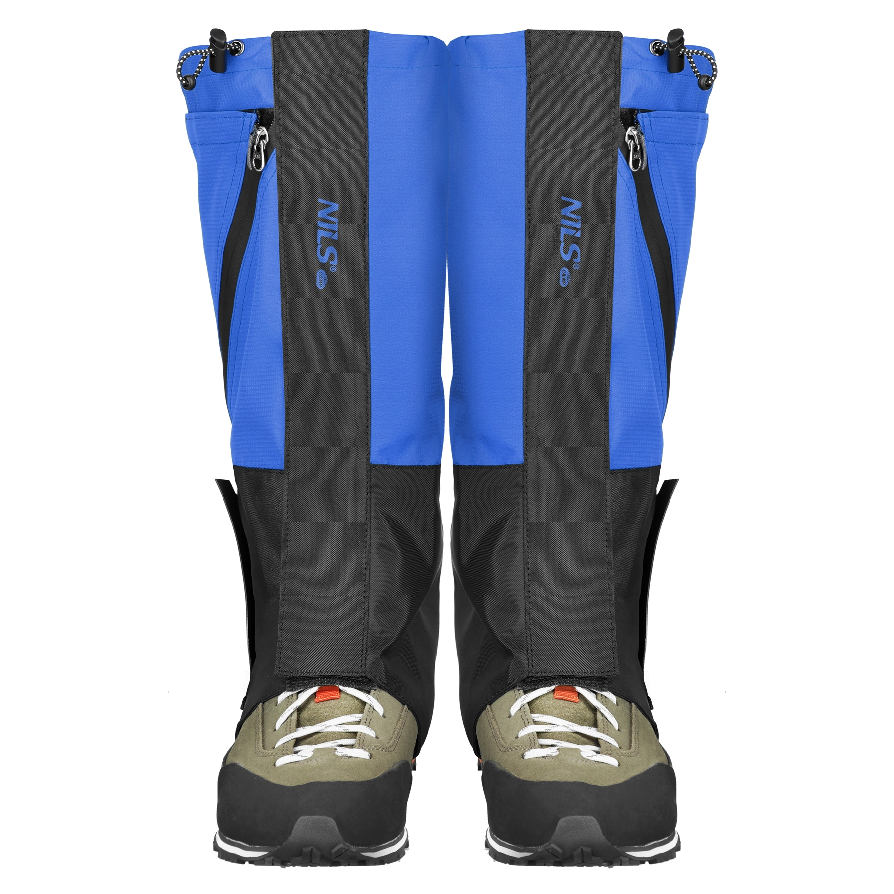 Durable NILS Camp NC17112 hiking gaiters reliably protect footwear and the lower legs from snow, water, mud, and debris. The lightweight, flexible nylon resists abrasion and moisture, the upper drawcord cuff keeps the gaiters in place, and the smart ventilation increases comfort while walking. Easy, fast closure with hook-and-loop, a strap under the shoe, and a lace hook ensure a secure fit in rough terrain.