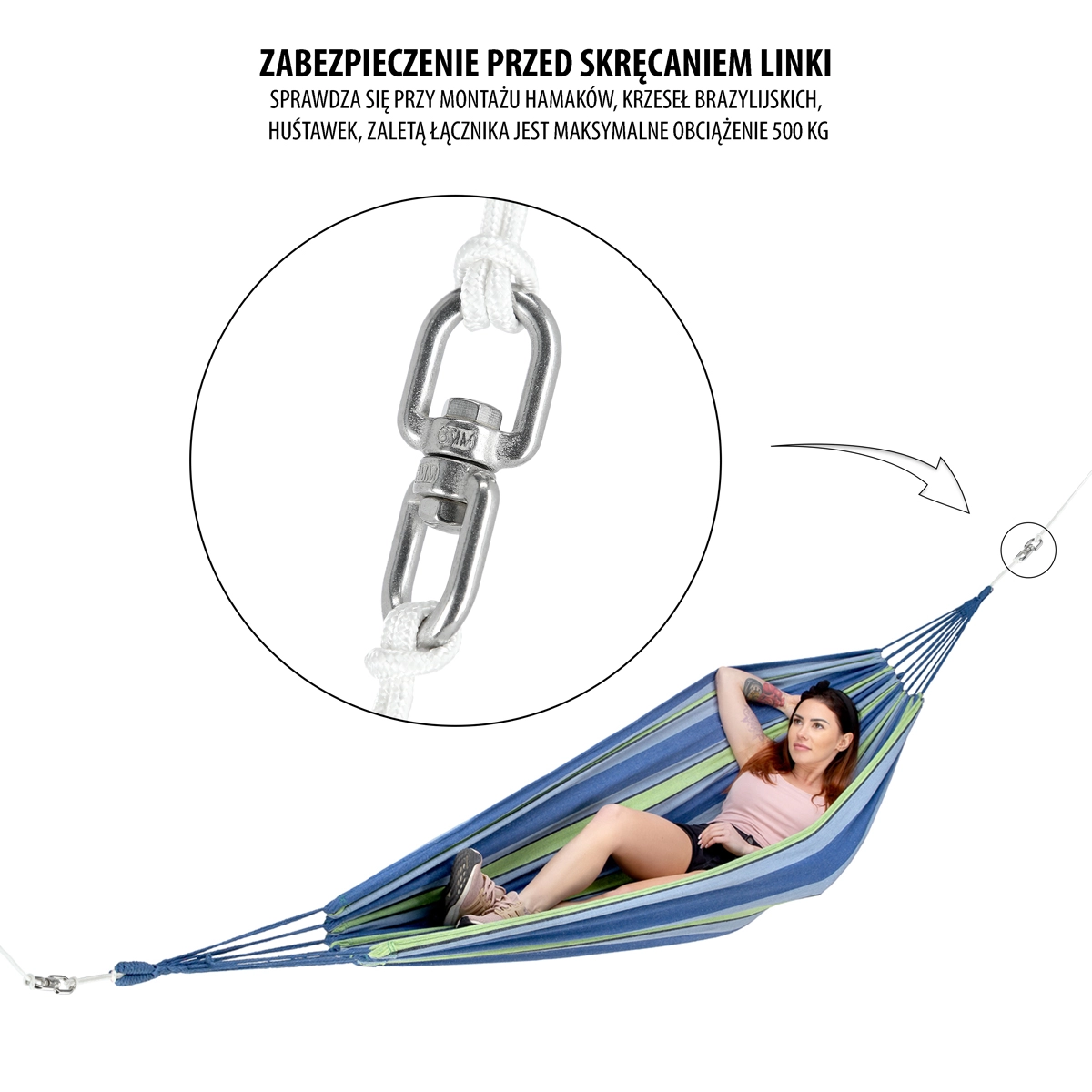 The NILS Camp swivel eye effectively prevents rope twisting, increasing comfort and safety while swinging. It is ideal for hanging chairs, hammocks, and other suspended equipment where smooth rotation without stressing knots and anchoring elements is required.