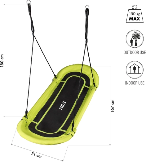Enjoy relaxation and fun in the garden with the oval stork’s nest swing NILS Camp NB5044. It offers a super-spacious seating area of 167 × 71 cm, a durable steel frame, and hard-wearing materials suitable for all-season outdoor use. Thanks to adjustable ropes up to 180 cm, you can easily hang it on various structures. The 150 kg load capacity ensures safe use for both children and adults.