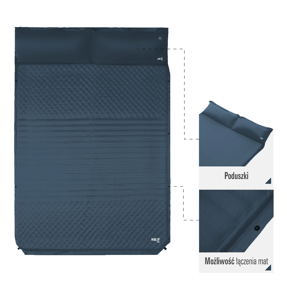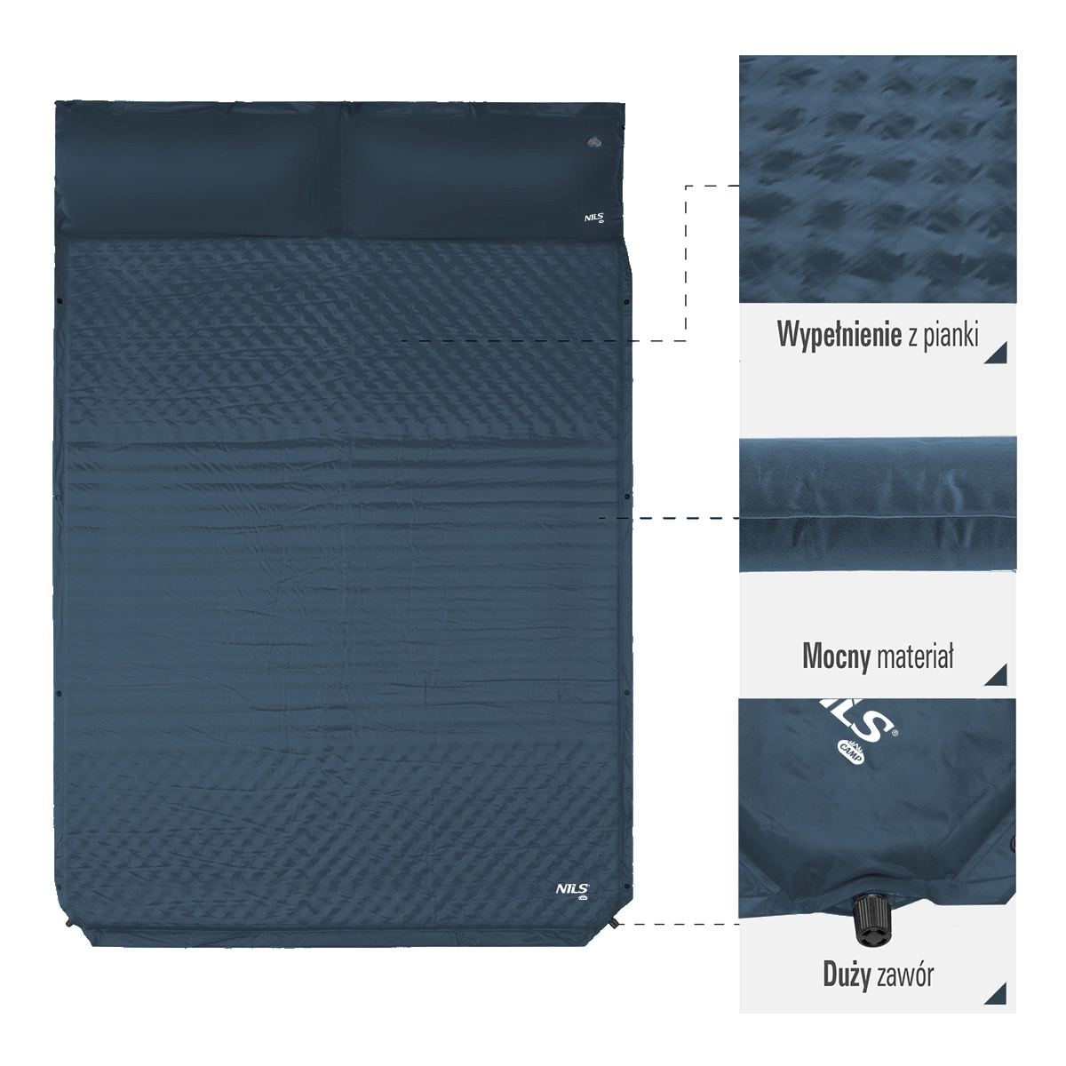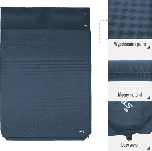 Enjoy comfortable sleep anywhere with the NILS CAMP NC4060 double sleeping pad. Thanks to the self-inflating system, simply open the valve and within moments you have a cozy base ready. A width of 130 cm, an integrated pillow, durable materials, and compact packed dimensions make it an ideal choice for camping, tenting, and beach lounging.