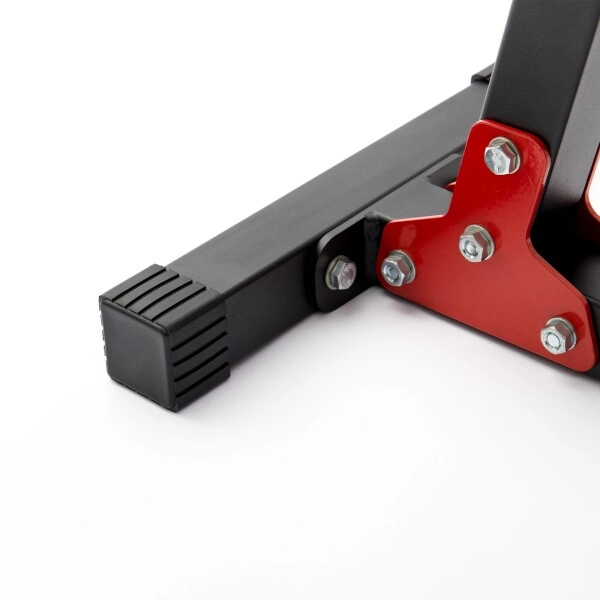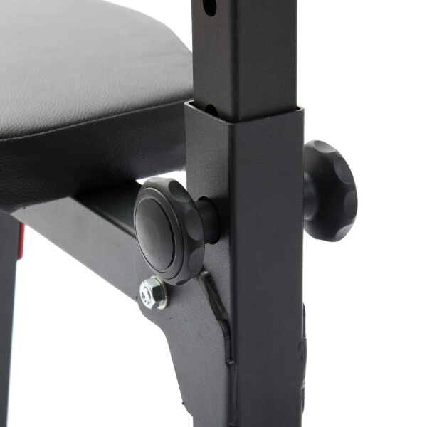 Ergonomically shaped padding made of high-quality synthetic leather with double stitching ensures comfort even during demanding workouts. Storage hooks with coarse protective rubber minimize noise and prevent scratching of the bar and frame. The powder-coated finish protects the frame from abrasion and corrosion, and rubber feet keep the bench firmly in place without damaging the floor.
