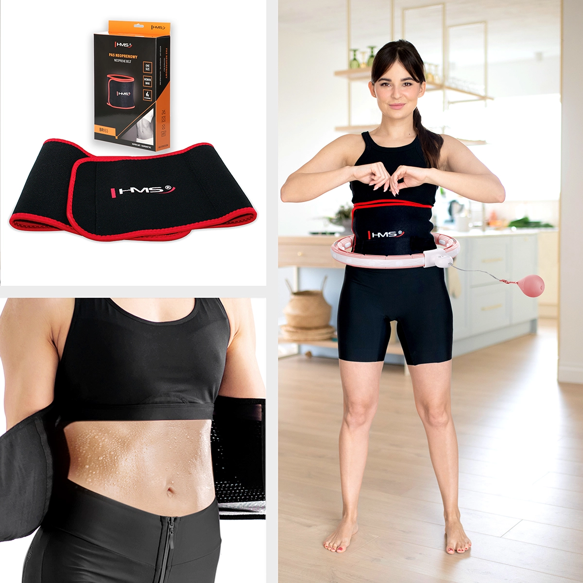 Complete home body-shaping set: the smart massage hula hoop HMS HHM15 with a adjustable circumference, magnetic massage studs, rotating weight, and an LCD counter is complemented by the HMS BR163 neoprene slimming belt for intensified sweating and support for calorie burn.