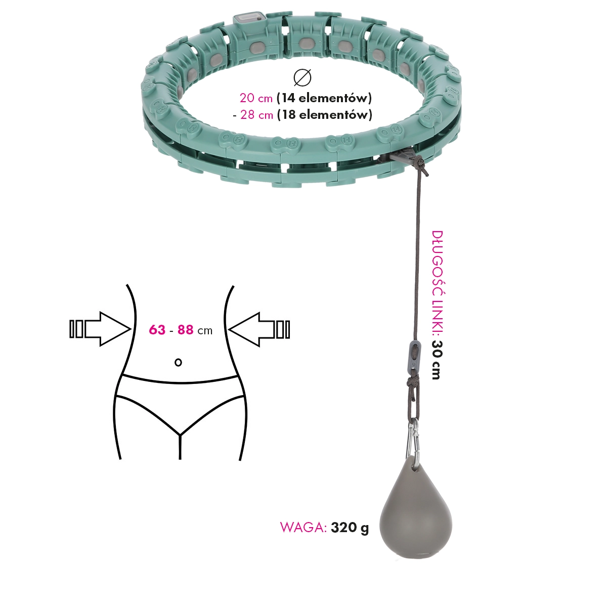 The smart massage hula hoop is made of modular segments that you simply snap together to match your waist circumference. The inner massage nodes pleasantly stimulate the abdomen and hips while also damping vibrations. Thanks to the rotating weight on bearings, you get a smooth motion and higher training efficiency, which you control by the speed of circling and the length of the cord.