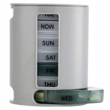 The Weekly Pill Organizer makes it easy to plan and take your medication regularly. Seven individual containers sit in a stand; each box is labeled with the day of the week (EN) and divided into 4 compartments — morning, noon, evening, night. Simply pull a container out from the bottom, take your dose, and place it back on top — the system is fast, clear, and hygienic.