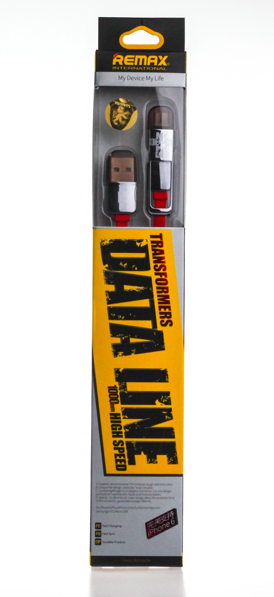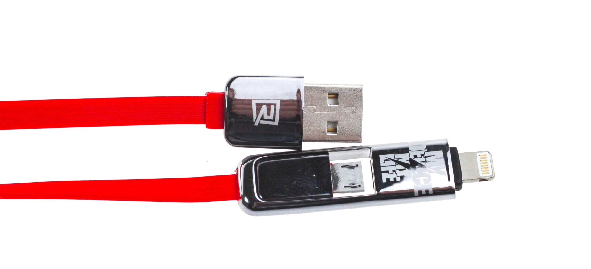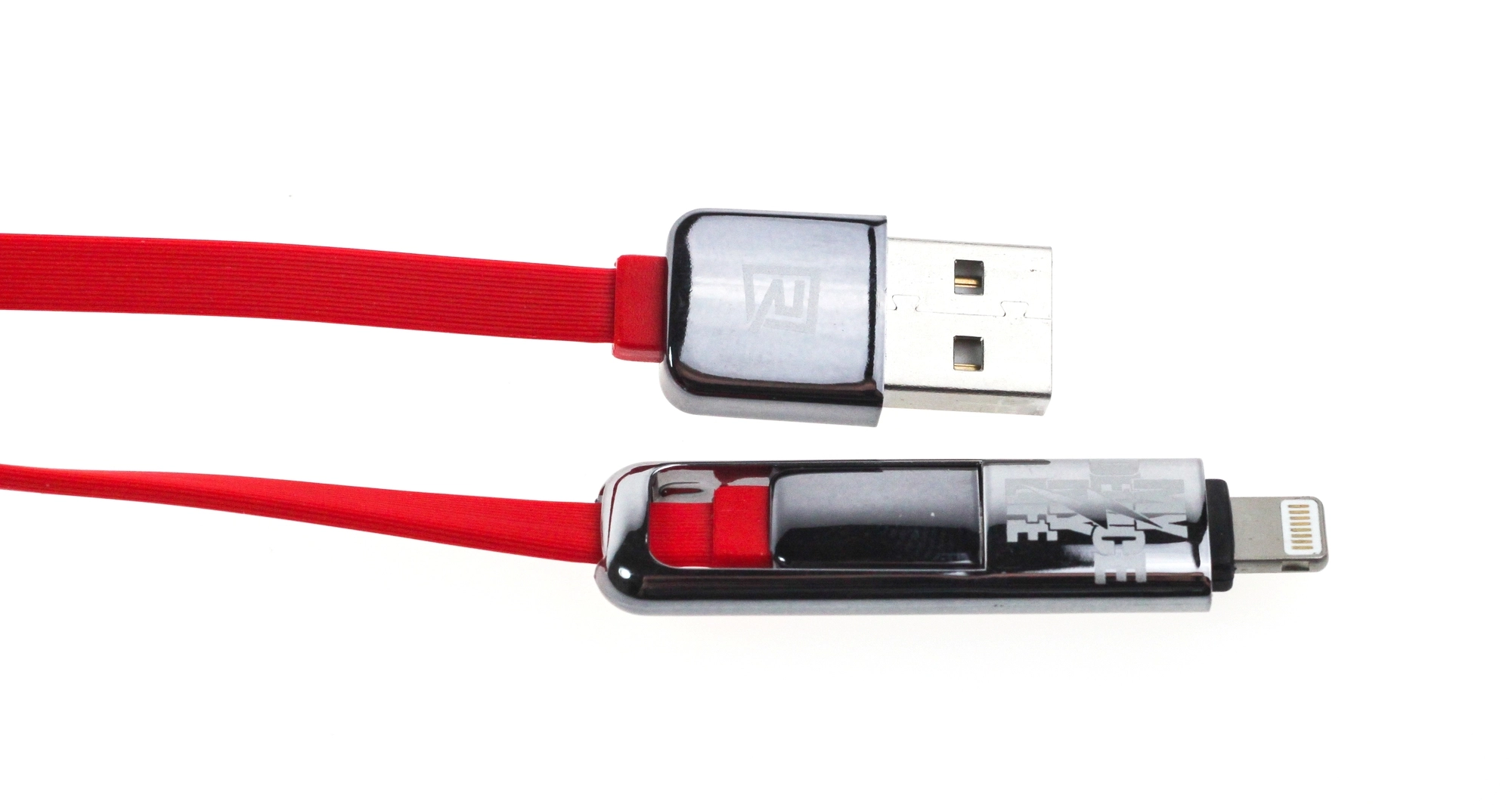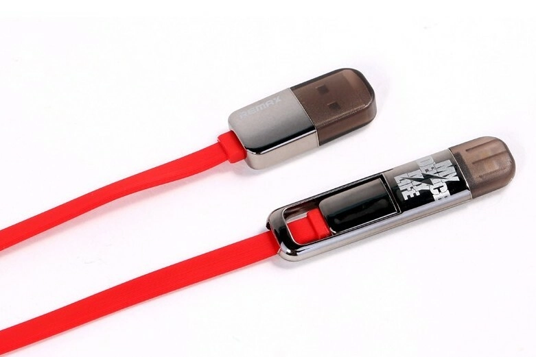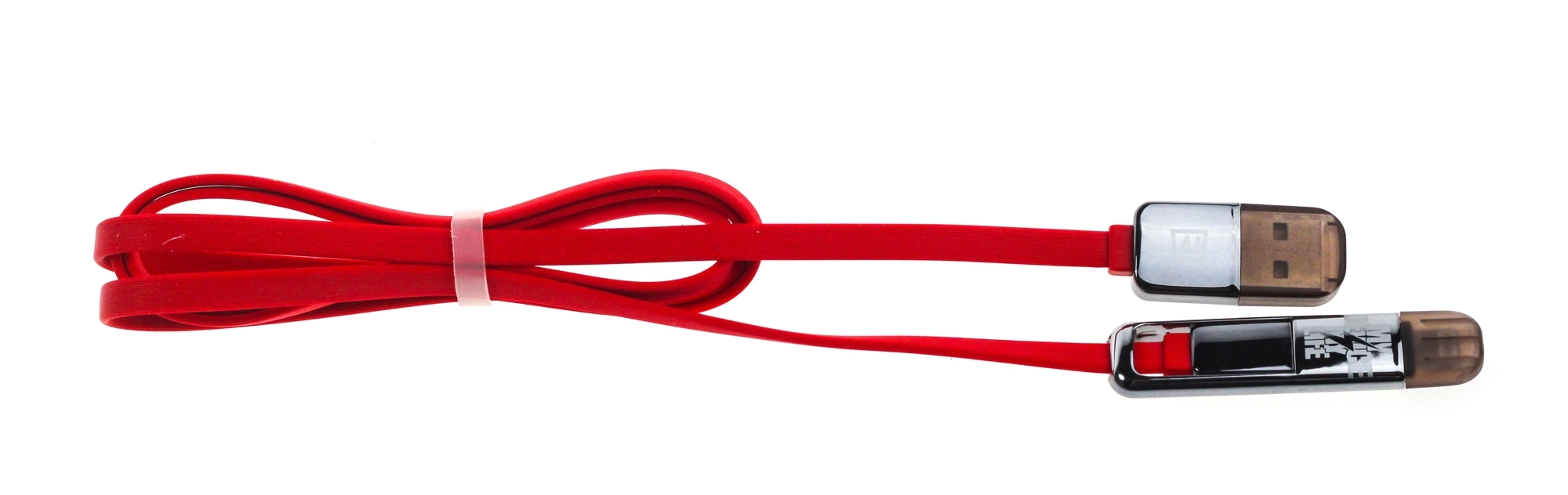 The practical Remax King-Kong 2-in-1 cable in elegant red combines compatibility for phones with micro USB and APPLE devices with a Lightning connector. The flat design reduces tangling, while sturdy ends with metal accents increase durability and reliability for everyday use.