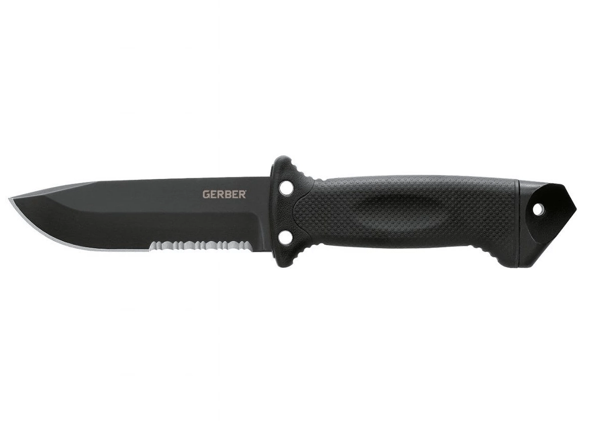 Durable tactical knife GERBER LMF II Infantry with a fixed 420 stainless steel blade and black finish offers reliability in demanding conditions. The rubberized GFN handle fits perfectly in the hand, absorbs shock, and is electrically insulated. Includes a ballistic nylon sheath with MOLLE compatibility, an integrated sharpener, and a seatbelt cutter.